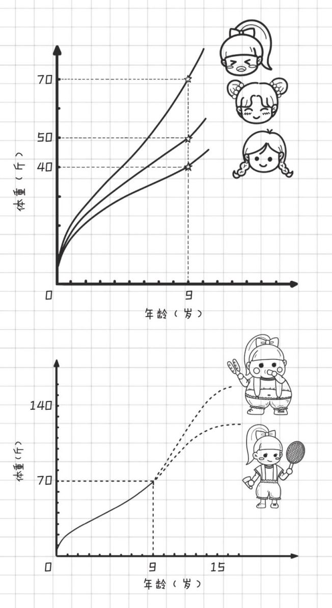 “不是啊,你现在是小朋友,所以会一直长,长成大人以后体重就稳定了,所以这条曲线以后会拐弯,变成这样。当然,如果你吃太多东西,又不锻炼,也可能是这样的。”妈妈一边笑一边画了两条延长线。