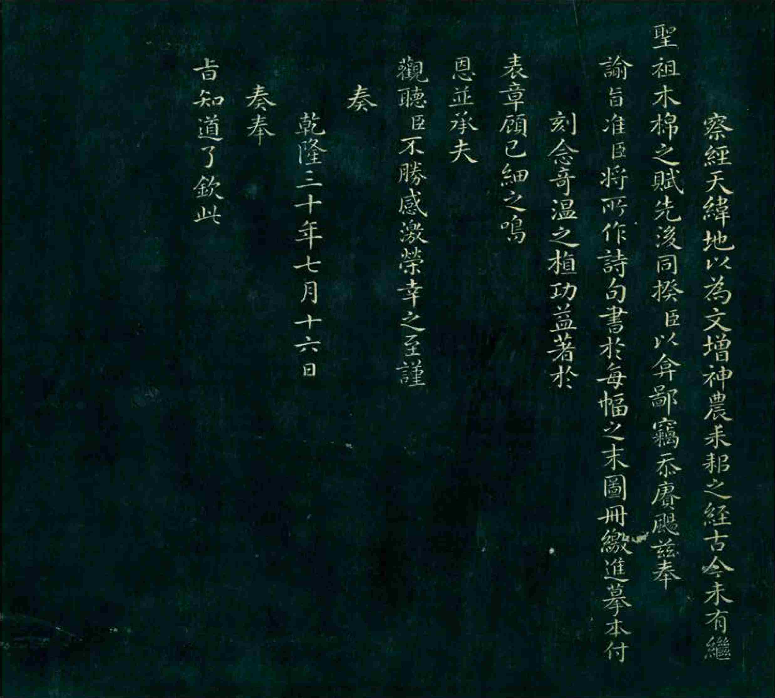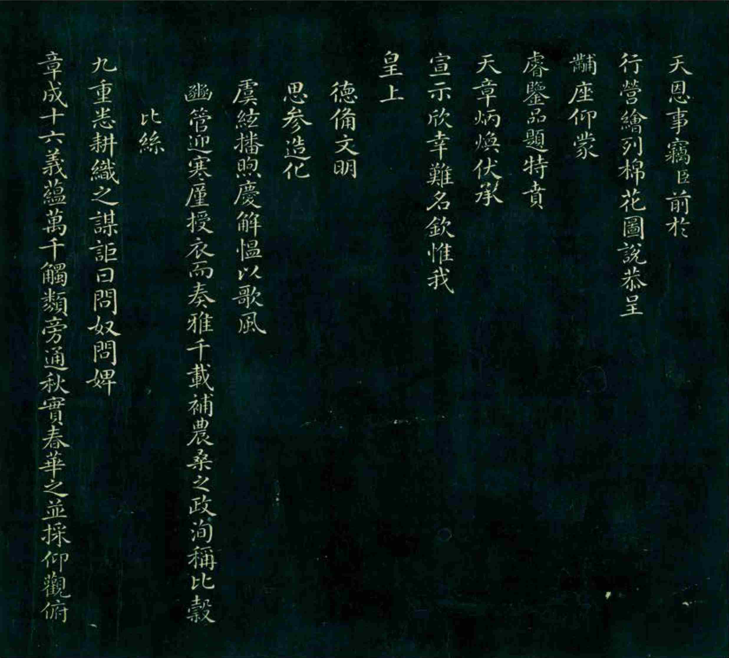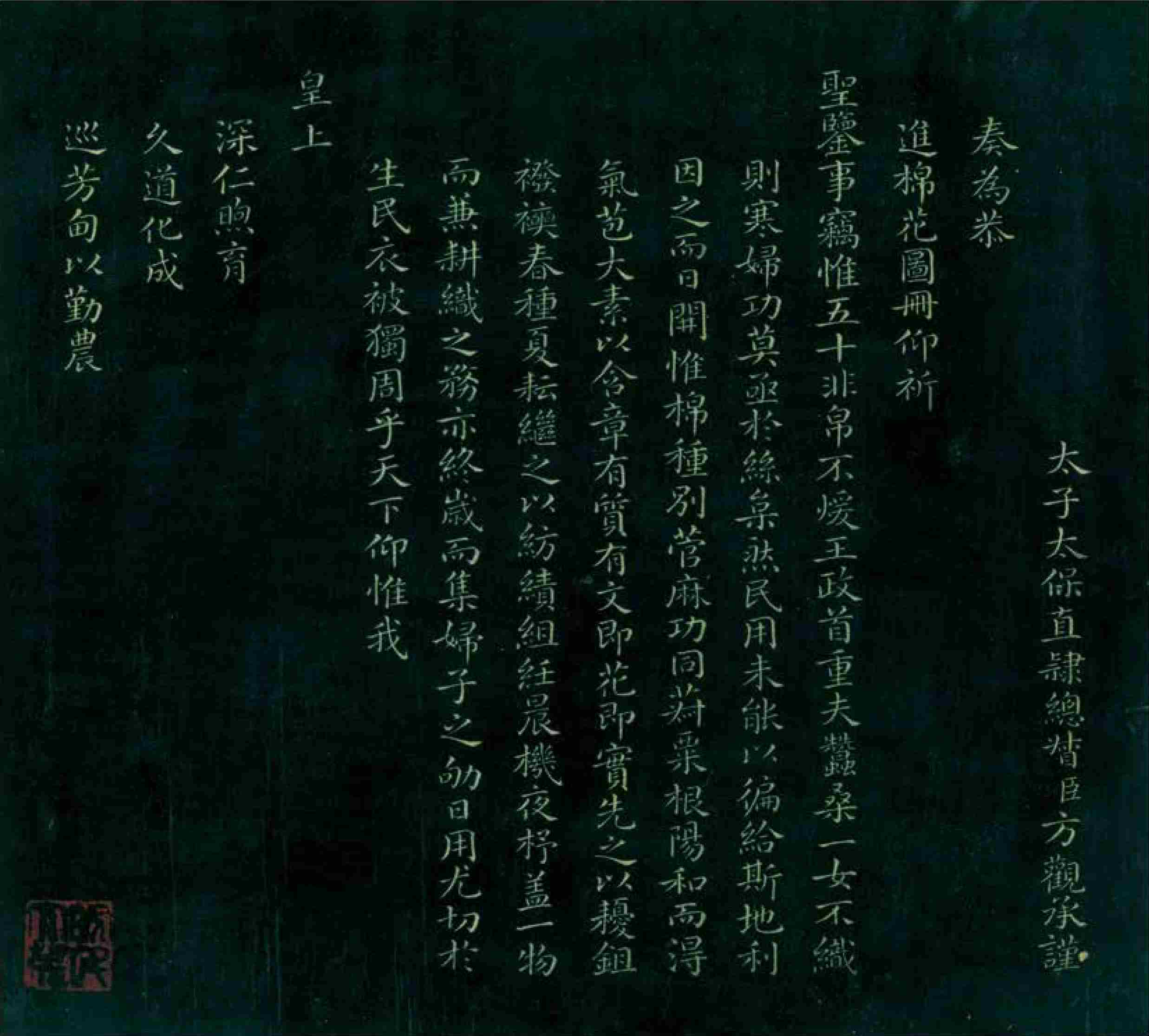 Statements to the Emperor by Fang Guancheng (this page and three pages to the left) These were two statements submitted by Fang Guancheng, a grand minister during the reign of Emperor Qianlong of the Qing Dynasty, who held positions of the grand guardian of the heir apparent and governor-general of Zhili. Fang valued cotton production and worked to promote its cultivation. He oversaw the creation of 16 illustrations depicting cotton cultivation and textile techniques, which he presented to Emperor Qianlong and received recognition. He was authorized to engrave these images into stone, and with the emperor’s approval, he compiled a set of prints titled Imperially Inscribed Cotton Prints.
