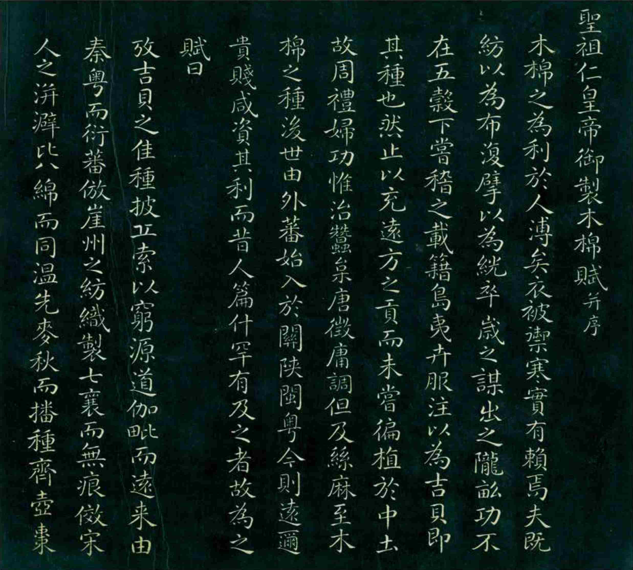《御制木棉赋并序》 (右页、左页) 此为清圣祖康熙所写《御制木棉赋并序》,通过讲述棉花的来源、种植、功用及价值,盛赞其“功不在五谷下”,体现了重农、劝农的思想。
