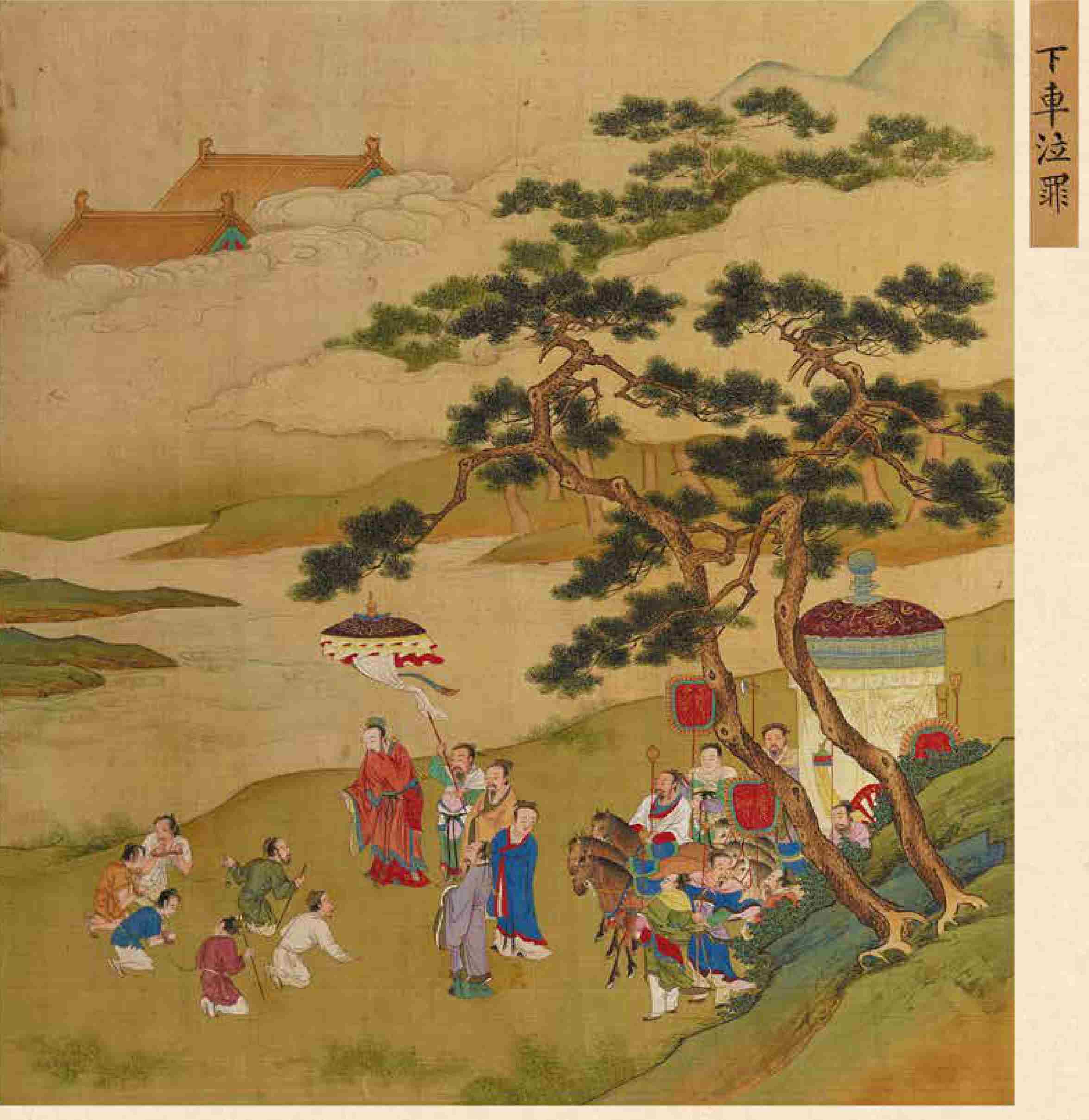 Getting Off the Cart for Self-accusation Yu succeeded Shun in becoming the new leader of the union of tribes thanks to his efforts in taming the floods. One day, when he was on an inspection tour in a cart, he saw guards escorting several criminals. Upon hearing that they had been arrested for stealing rice, Yu did not get angry, but instead burst into tears. He said, “When Yao and Shun were on the throne, all the people abided by law and behaved themselves. But now they hurt others for their own sake after I acceded to the throne. If anyone’s to blame, it’s me.” He had a tortoiseshell carved with a sentence that read, “The guilt of the people lies in me, ” and set the criminals free.