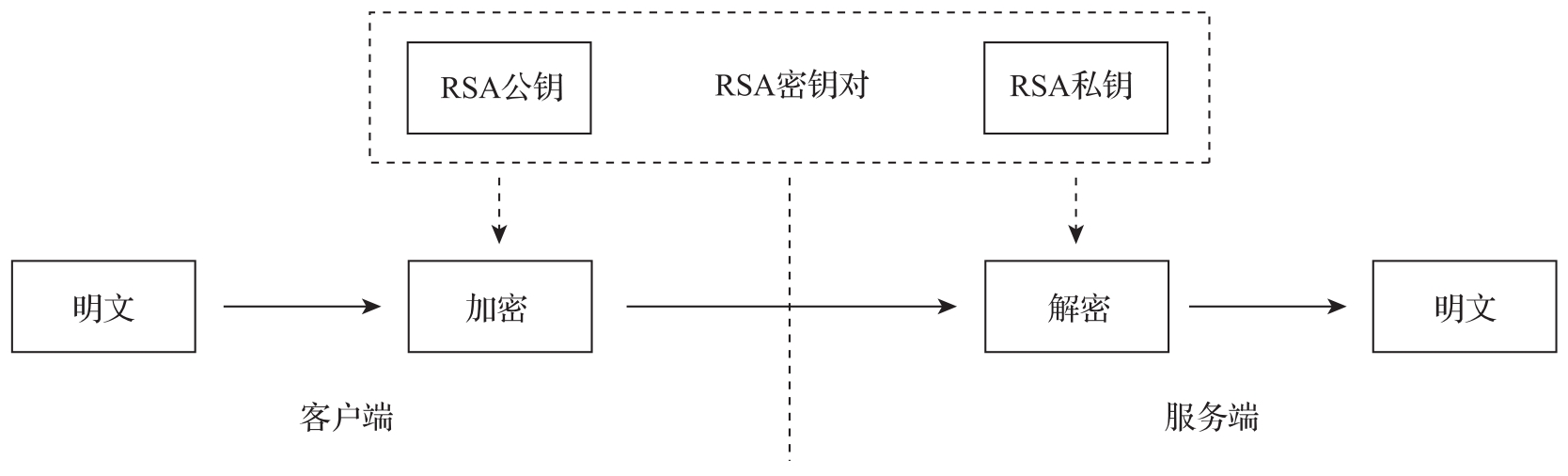 2) RSA: 一种非对称加解密算法,所谓非对称,就是指该算法需要一对密钥,使用其中一个加密,则需要用另一个才能解密;基于这个特性,RSA常用于客户端与服务端的数据传输,在客户端及服务端分别存放加密及解密的密钥,如图2-4所示, 客户端发送数据时使用公钥对数据加密 ,然后通过网络传输加密后的数据, 服务端收到数据后使用私钥对数据解密 ,这样即便加密的公钥被公开了,数据传输的保密性也是有保障的。
