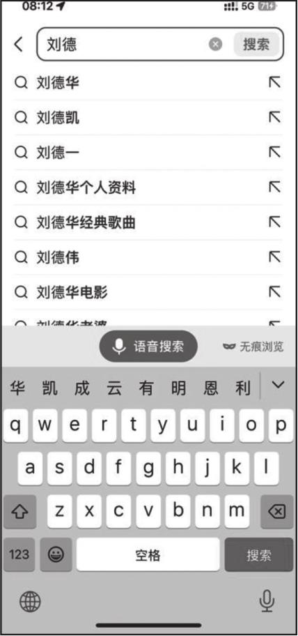在用户输入文本的过程中,客户端“监听”输入内容的变化,向服务端(服务器)实时提交输入的关键字信息,并由服务端生成用户可能会搜索的关键字列表(搜索建议),客户端在收到服务端的搜索建议后会展现给用户。如图2-3所示,用户输入“刘德”,客户端向服务端提交获取“刘德”搜索建议的请求,服务端返回一组搜索建议信息如“刘德华”“刘德凯”“刘德一”……当用户选中“刘德华”时,就进入了结果页场景,此时客户端向服务端提交搜索“刘德华”的请求,加载结果页。