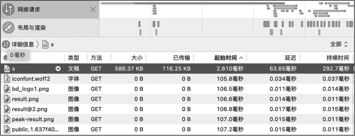 如图2-6所示,通常情况下,结果页需要加载的资源可能有多个,因此浏览内核会依次向服务器提交请求,下载相关资源,并在下载完成后渲染结果页,直到整个页面加载完成。页面加载完成后,用户可通过上下滑动来浏览页面。当用户点击页面中的结果条目时,会加载落地页。