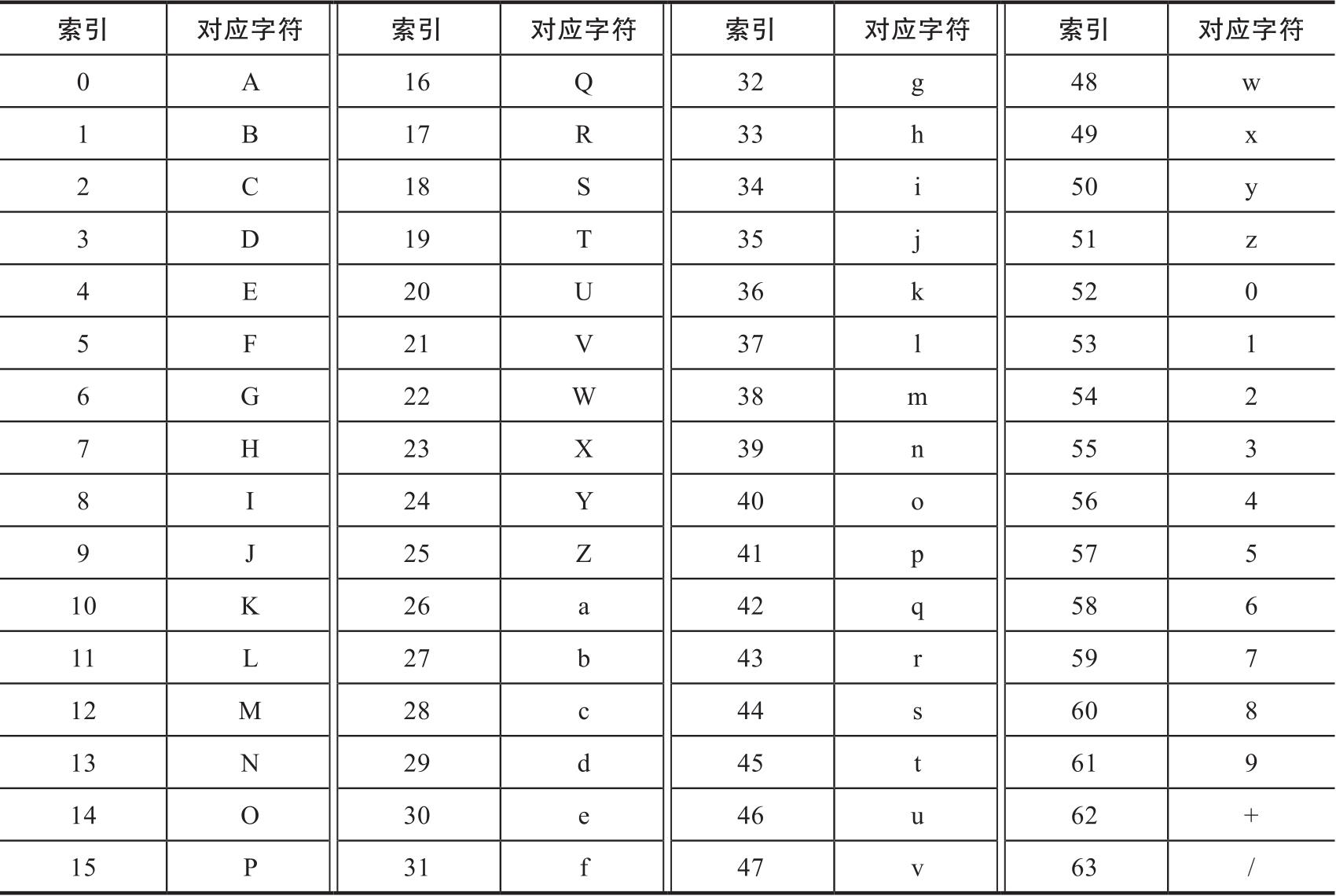 1) Base64: 一种对称的加解密算法,所谓对称,就是指该算法加密和解密所用的密钥是相同的,Base64基于64个可打印字符来表示二进制数据,由于64=2 6 ,所以可打印字符每6位(比特)为一个描述单元;Base64通常用于文本数据处理的场合,用来表示或存储数据,常见于页面中的二进制数据描述;为了保证所输出的编码为可读字符,Base64制定了一个编码表。编码表有64个字符,这也是Base64名称的由来;Base64编码把原来每3个8位的字节(3×8=24)转化为4个6位的字节(4×6=24),字节前两位均为0,常用的编码表如表2-1所示;对于私有内容的加解密,也可以自建编码表来实现。