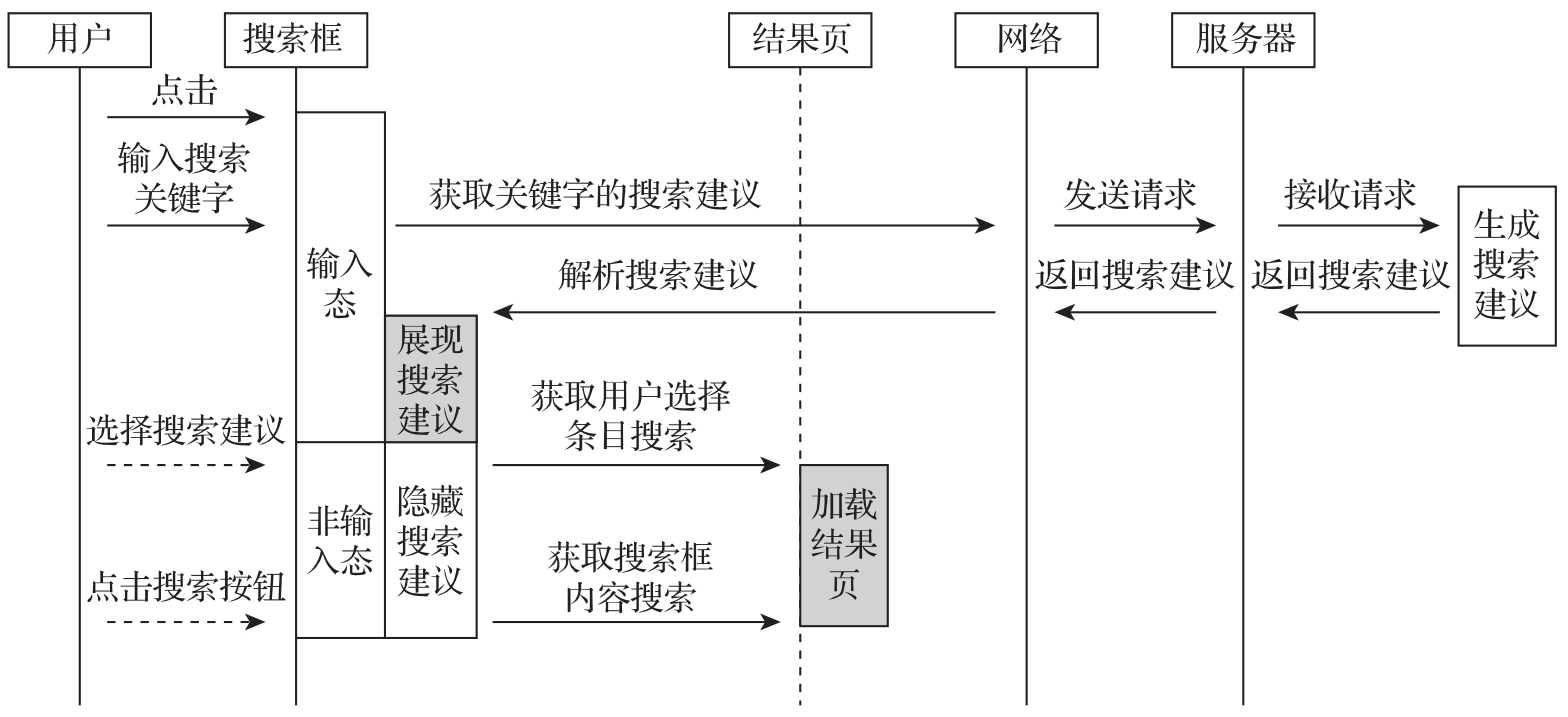 典型的文本输入搜索过程如图2-2所示,该过程主要分为输入搜索关键字、展现搜索建议、点击搜索按钮三个步骤,其中输入搜索关键字和点击搜索按钮的动作由用户触发,展现搜索建议为搜索客户端提供的辅助输入功能,下面对典型的文本输入过程进行介绍。