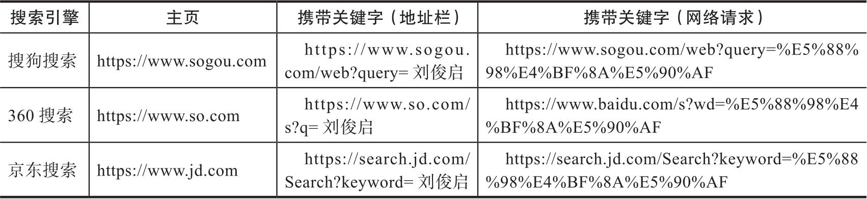 通过上述分析可以发现,每个搜索引擎中URL携带关键字的方式都有所不同。以表2-2所示的内容为例,sogou.com中的关键字的key是query,而so.com中的关键字的key是q。如果你对此感兴趣,可以使用表中带有中文的URL进行一次URL编码,或者在不同的浏览器中尝试不同的搜索引擎,观察它们如何在URL中描述关键字。