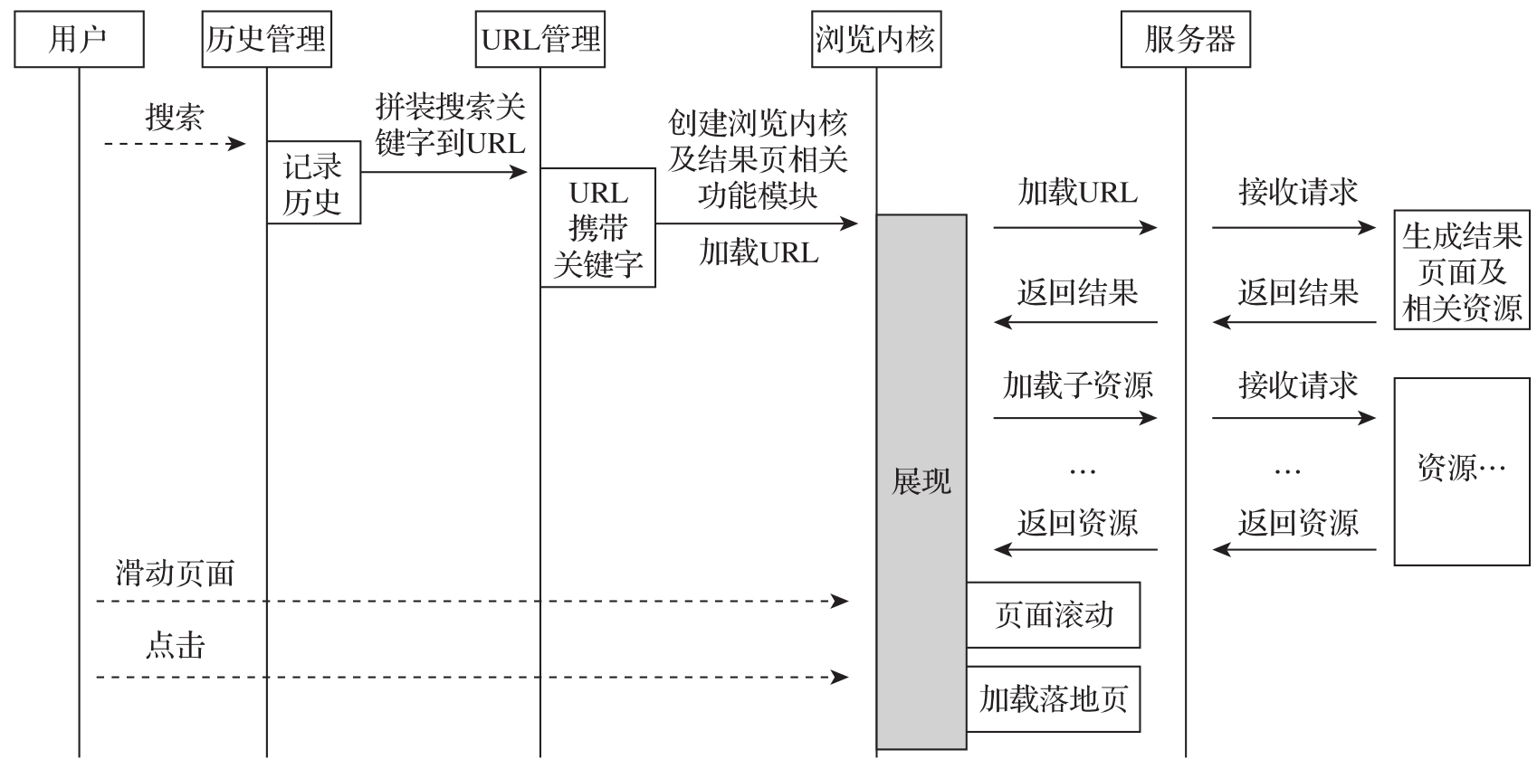 如图2-5所示,用户发起搜索时,客户端会保存搜索记录即记录历史,并将搜索关键字拼装到URL中传给搜索服务器。之后客户端切换到结果页场景,创建浏览内核及结果页相关功能模块,调用浏览内核向服务器请求加载携带搜索关键字的URL。服务器接收到请求后,提取URL中的关键字进行搜索,并生成结果页及相关资源。然后,服务器会将结果页主文档返回给客户端加载。浏览内核收到服务器的响应后,解析结果页内容。