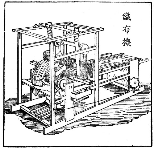 “在一具织布机上,他们把纺好的线,很整齐地一排排地列着许多,粗成他们所谓经线。织布的脚踏着的一块板往下一沉,这些线的一半便沉下去,另一半的线则升起来。同时织布人右把梭子上的线从线的两半之间横穿过去,从左到右,以后再从右到左。从这样的交叉中,织成的布便出来了。完工以后,那草本制成的布,便换了主人;大麻的皮变成了布,亚麻的皮变成了高贵的花边,一块要值得好几十块钱。”