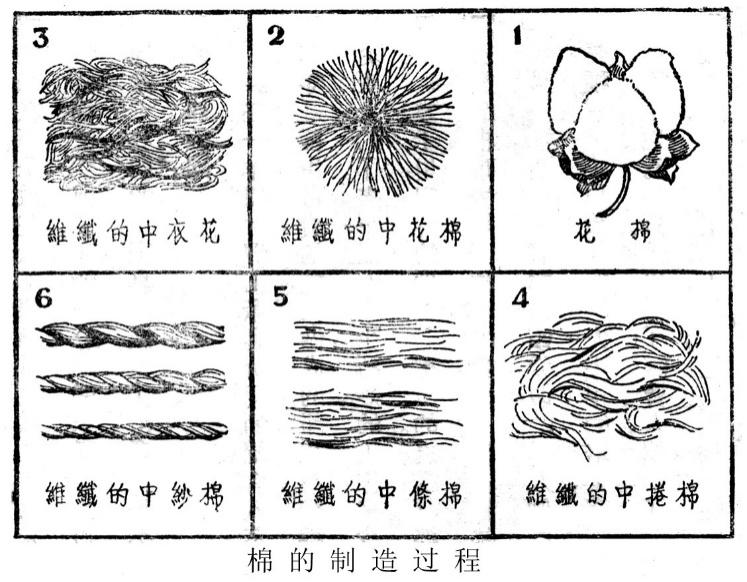 “棉团到了成熟时,便裂开来,它的棉绒脱出来成为软软的棉块,人们用手把来一团团地拾了。棉绒铺在布上放在太阳里晒干之后,便把打禾棒来敲,有的更好一点的,是把来放在某种机器上轧的,这样,棉便从种子和壳上分离开来了。从此以后,便不需要再有别种预备的手续,棉便一大捆一大捆地搬到我们的工厂里去做布了。出产棉花最多的国家是印度,埃及,巴西,最大产棉国要推北美合众国,即‘美国’。”