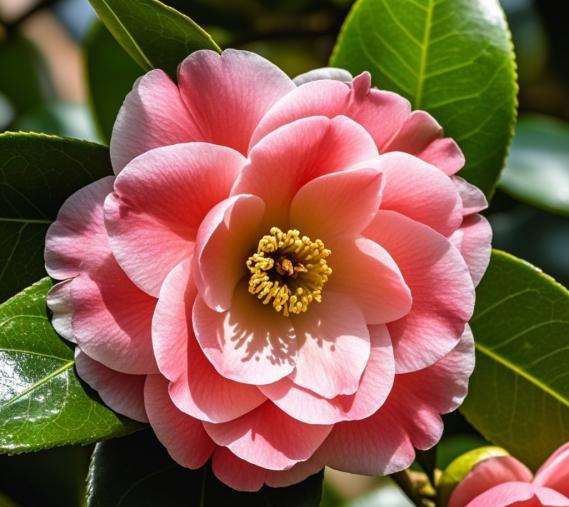 山茶花的形态端庄而秀丽。它的植株形态多样,有矮小玲珑的盆栽品种,适合摆放在室内,为空间增添一抹亮色;也有高大挺拔的乔木品种,可独立成景,成为庭院中的焦点。山茶花的花朵硕大而艳丽,花瓣层层叠叠,如丝绒般柔软细腻。花色丰富多样,有纯洁如雪的白色,给人以清新脱俗之感;有娇艳欲滴的红色,似燃烧的火焰,充满热情与活力;还有粉嫩柔美的粉色,如天边的朝霞,温柔而迷人。山茶花的花蕊金黄灿烂,与花瓣相互映衬,更显华贵之姿。山茶花的叶子浓绿而有光泽,形状优美,为花朵提供了完美的衬托。