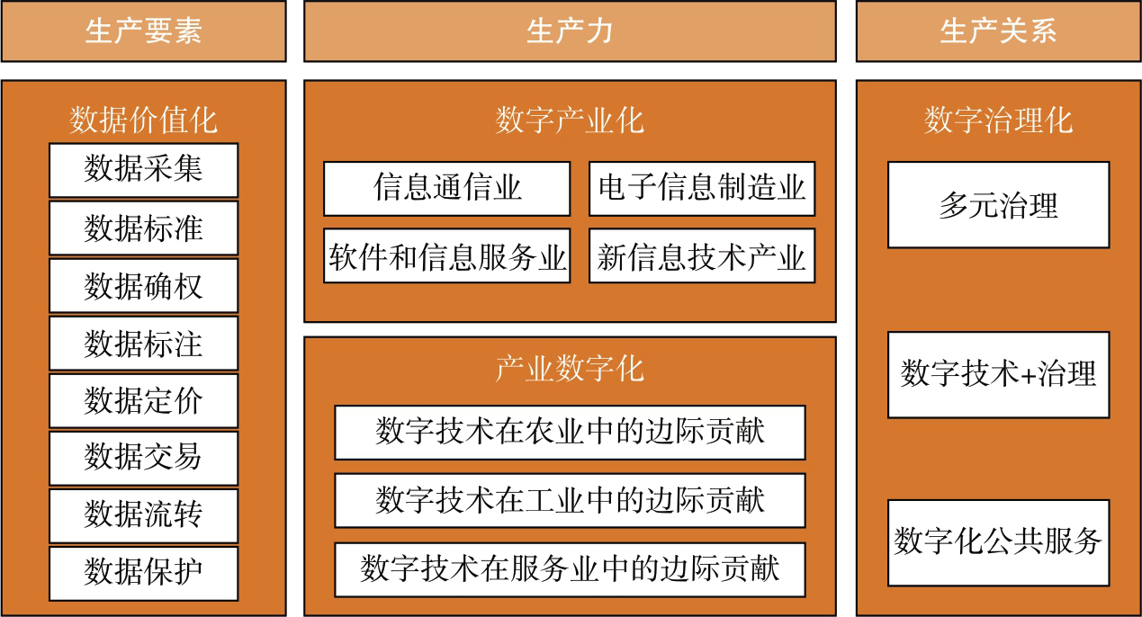 随着数字产业不断成熟,新的业态和生产模式逐渐形成,传统产业也受益于数字产业的成果,开始产业升级,进入产业联合和产业融合的阶段,最终凭借数字产业化和产业数字化重塑生产力。同时,数字治理化引领生产关系深刻变革,数据价值化重构生产要素体系和数字经济生态。