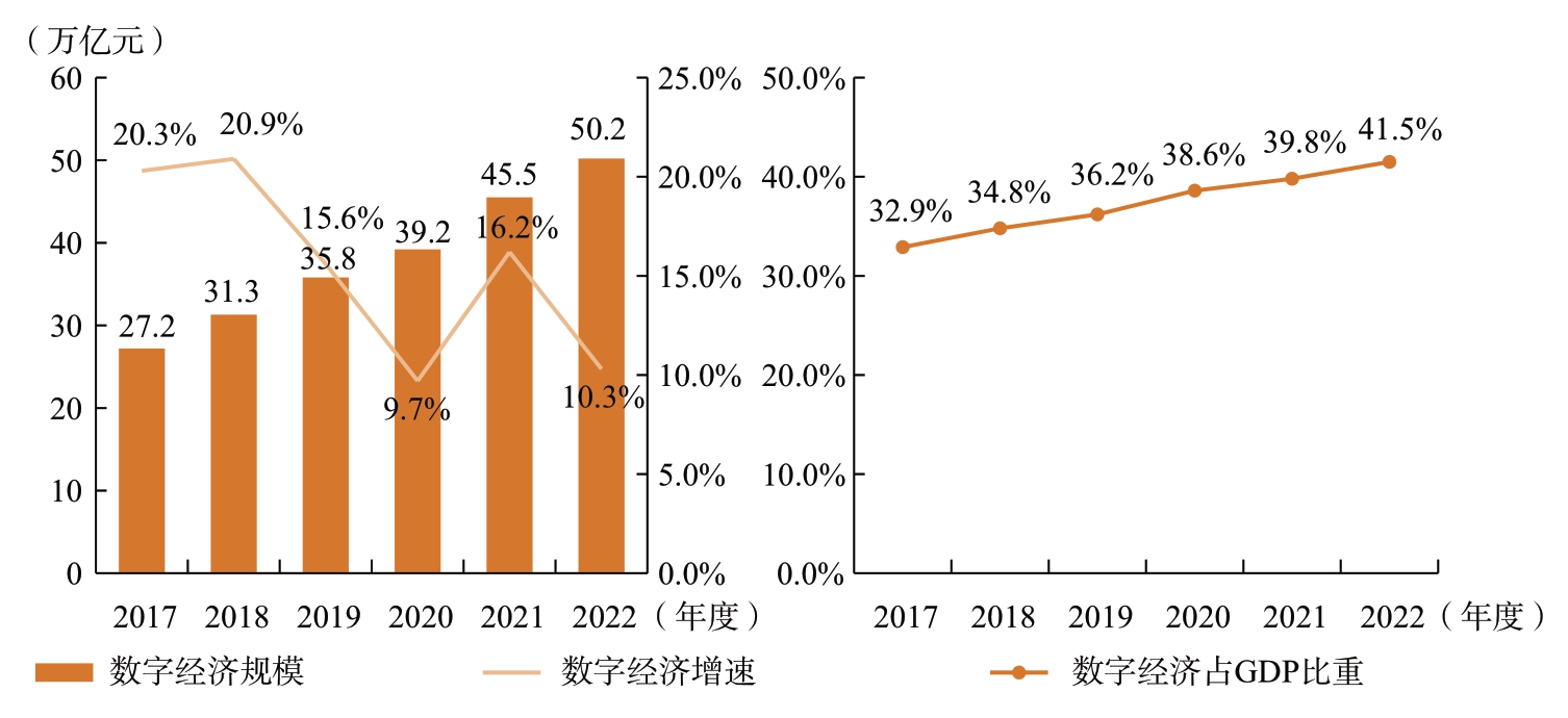 《数字中国发展报告(2022年)》指出,我国数字经济规模在2022年达到50.2万亿元,占GDP的比重为41.5%,稳居世界第二,且继续保持15%以上的高位增长速度。由此表明,数字经济已成为世界和我国推动经济增长的主要引擎。