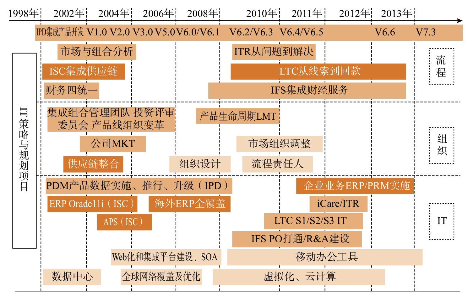 1999—2003年:集成产品开发项目。IPD就是指产品从有概念开始直到面市,全程强调以客户需求为导向,将产品开发作为一项投资来管理,重组产品开发流程和管理体系,以加快市场反应速度,并提升产品质量和竞争力,是一种先进、卓越的产品开发模式。