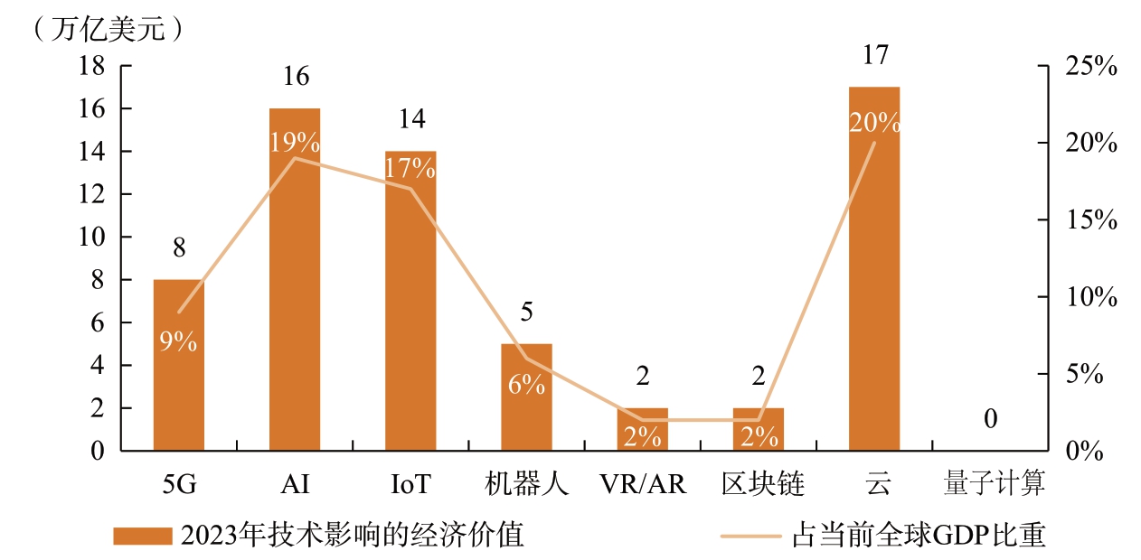 华为认为,数字基础设施是数字化的转型基石,数字化发展要靠数字技术。数字技术的生命力在于持续创新,不断创造价值。云、AI、网络等是关键的数字技术,对经济增长有积极的影响。从5G、AI、IoT等新兴技术的角度看,它们未来也将创造数十万亿美元的经济价值,如图2-5所示。