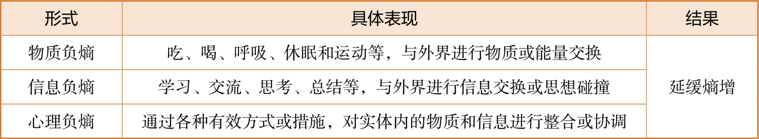 熵增的过程,就是系统趋向于平衡状态和稳定结构的过程,引入负熵可以打破这种平衡和稳定,促成系统实现熵减。负熵一般包括物质负熵、信息负熵、心理负熵三种形式,如表1-2所示。