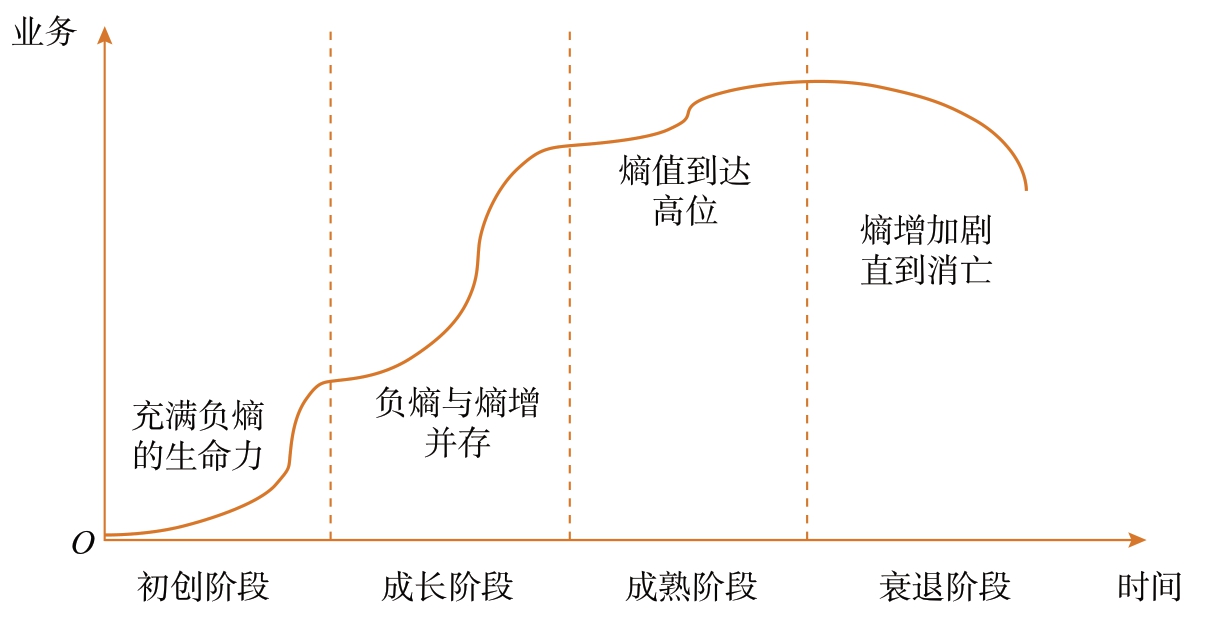 除此之外,企业像任何有机体一样,是有生命周期的。在不同的生命阶段,它的熵也会逐渐变化。根据企业生命周期理论,企业的发展通常可以分为初创、成长、成熟和衰退四个阶段,如图1-1所示。企业处于不同生命阶段的决定因素在于企业是逐渐走向有序还是逐渐走向混乱,而描述物质有序度的“熵”能合适地表达企业生命的特征。