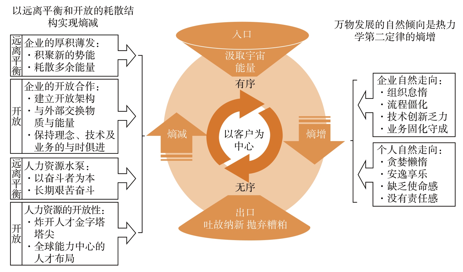 可见,耗散结构是企业对抗熵增的重要解决方案。企业通过建立耗散结构,对内激发活力,对外开放,与外部交换物质和能量,将新理念、新思想、新人才、新技术等有利于增强负熵的若干因素引入企业管理系统中,不断提升企业发展势能,拓展业务发展的作战空间,并根据发展需要对企业进行管理变革、流程再造及管理创新,让企业从混乱无序的状态回归有序发展的状态,持续地激活企业的活力。