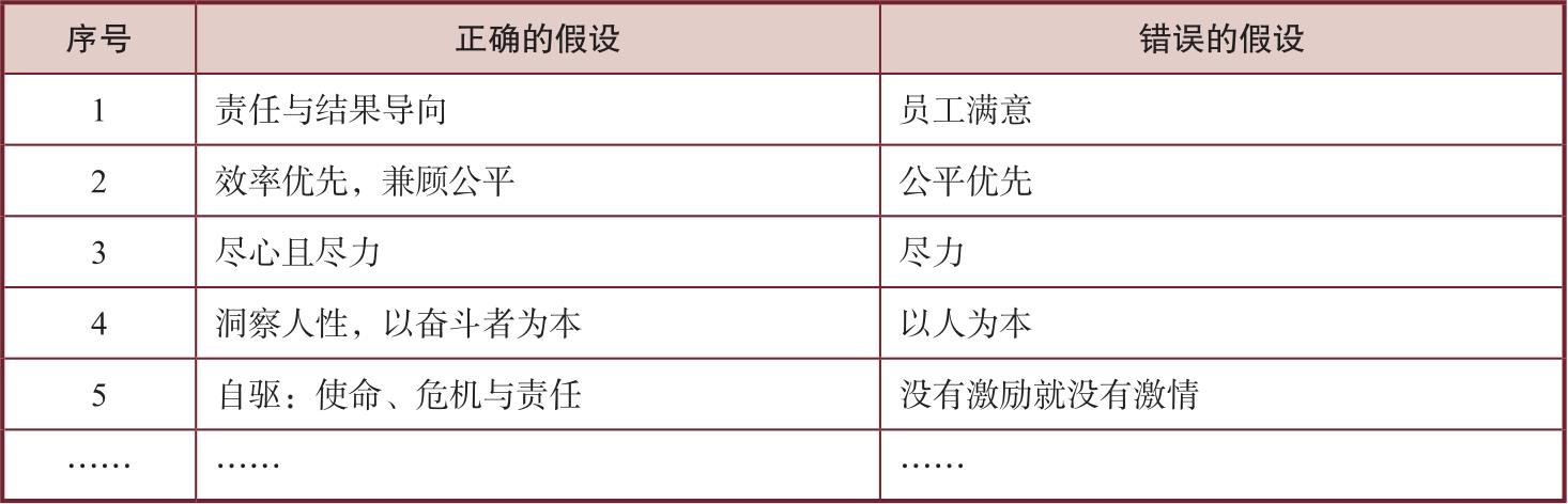 只有正确的假设,才有正确的思想,才能引导正确的行为,最后产生正确的结果。基于此,德石羿团队在华为多年管理实践的基础上,基于企业文化与价值观管理提出了多重假设(见表2-1),以引导员工采取正确的行为,产生正确的结果,目的是营造一种高绩效、高激发的正能量氛围。