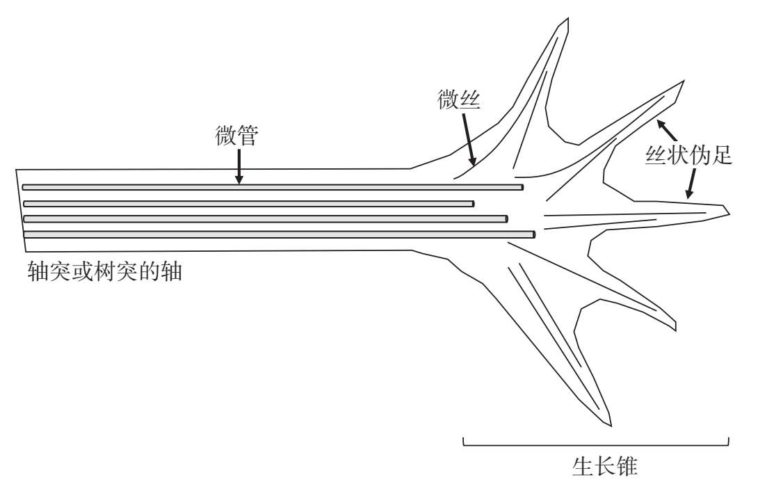 轴突或树突的伸长及生长锥的形状和运动都受蛋白质链状聚合物的控制。在轴突或树突的轴内有微管蛋白的聚合物,形成了直径约为25纳米的空心小管。生长锥的丝状伪足没有微管,但有肌动蛋白聚合物组成的微丝。微丝的直径约为6纳米,微管和微丝的长度可以增加或减少。微管具有极性,从而使微管蛋白被添加到最靠近生长锥的微管末梢。因此,轴突或树突的延伸需要在最靠近生长锥的微管末梢加入微管蛋白,而另一端的微管蛋白则极少或不被移除。微丝的情况也是如此,它的延伸依靠在丝状伪足的顶端添加肌动蛋白。