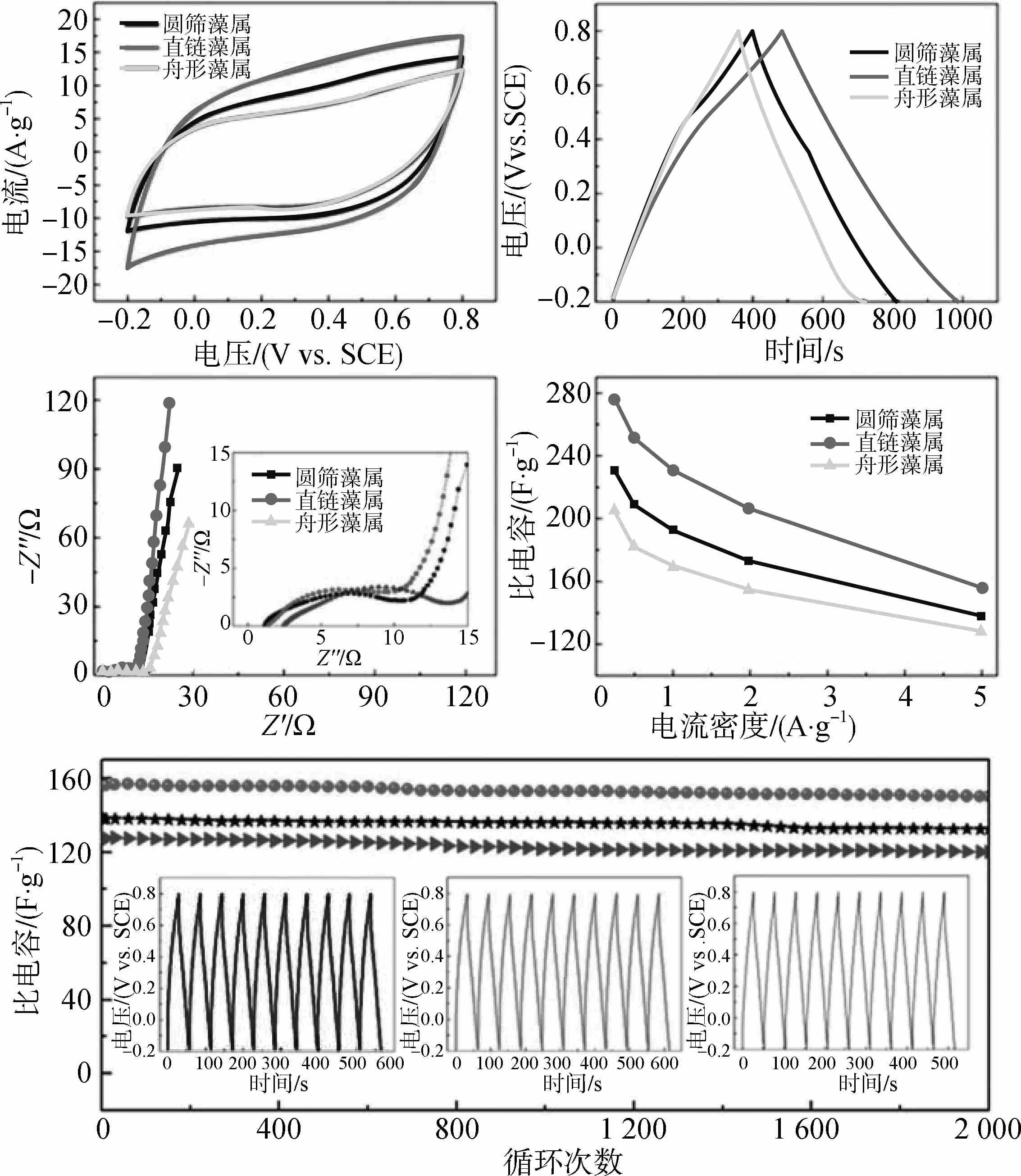 纯化后的硅藻表现出8F·g -1 的比电容能力,而通过一锅水热法获得的分级多孔MnO 2 改性硅藻表现出更高的功率能力,为202.6F·g -1 。由于硅藻表面的独特结构,观察到MnO 2 改性的纳米片在纯化的硅藻土上垂直生长,增加了电极的比表面积,从而构建了分层结构。此外,蚀刻硅藻土后的MnO 2 纳米结构具有更高的功率容量(297.8F·g -1 )和良好的循环稳定性(5000次循环后保留95.92%)。随后,他们提出,直链藻属型的MnO 2 图案在0.5A·g -1 的扫描速率下表现出371.2F·g -1 的比电容和良好的循环稳定性[在5A的扫描速率下2000次循环后电容保持率为93.1%g -1 (见图4.5)] [90] 。基于这些结果,分级多孔MnO 2 改性硅藻土复合材料被清楚地证明是一种有前途的低成本、环保和电化学稳定的活性材料超级电容器。