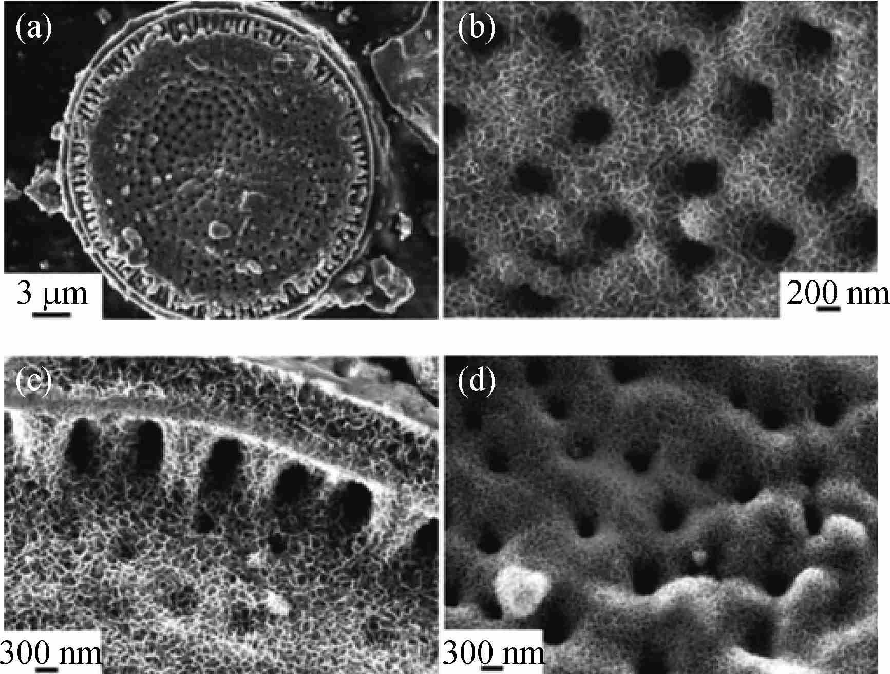 Zhang等率先提出了使用硅藻土3D结构与锰和镍氧化物相结合并制造用于电化学电容器应用的复合电极的概念,表明这些发展的宝贵潜力 [89-92] 。图4.4显示了用于制造超级电容器电极的MnO 2 改性硅藻结构的典型形态,证实了MnO 2 涂层在硅藻二氧化硅结构上具有纳米纤维结构,并保留了它们的孔和整个形状 [93] 。