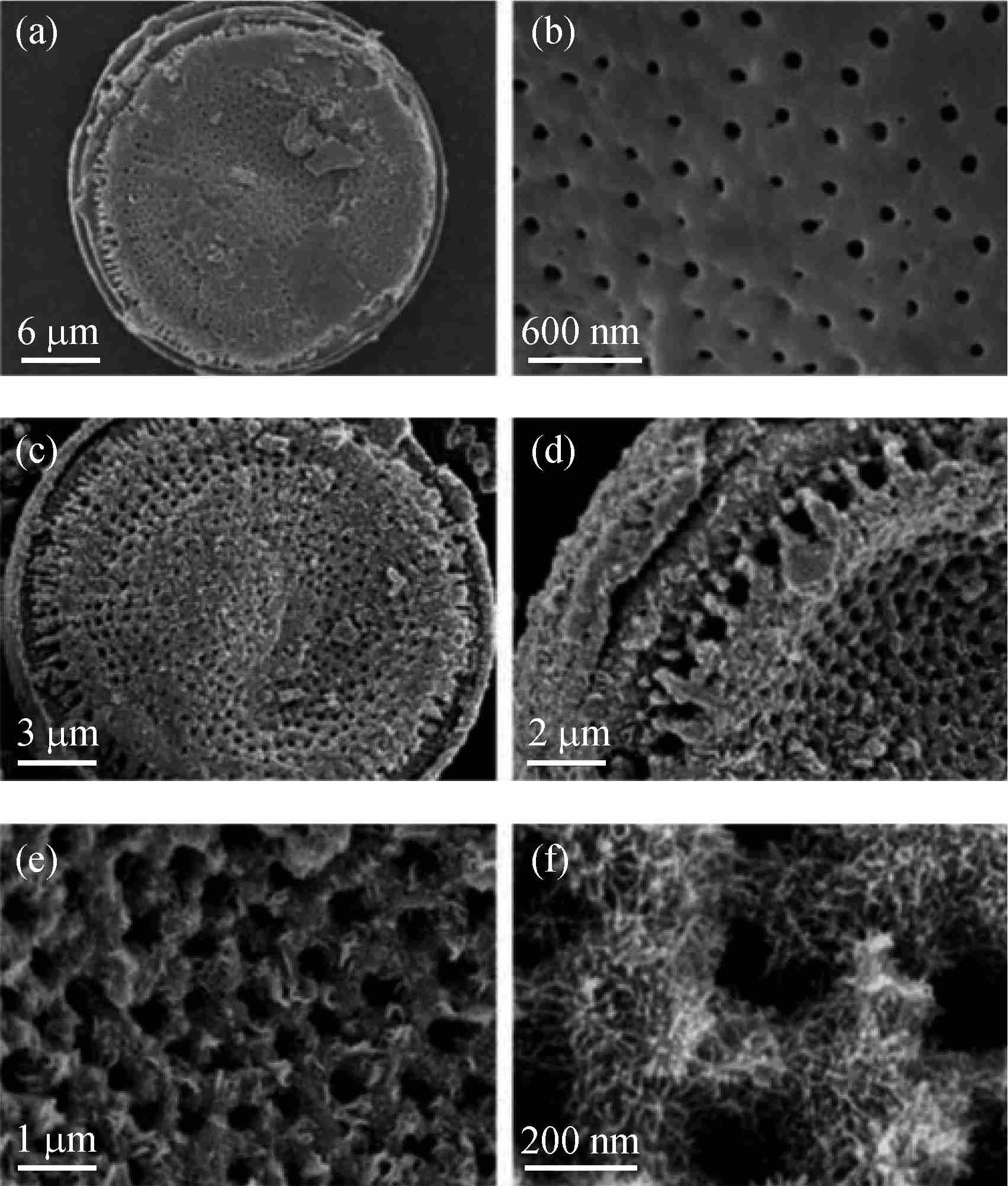 (a)和(b)纯化硅藻土;(c)和(d)NiO改性硅藻土复合材料;(e)和(f)硅藻土壳中心的孔隙