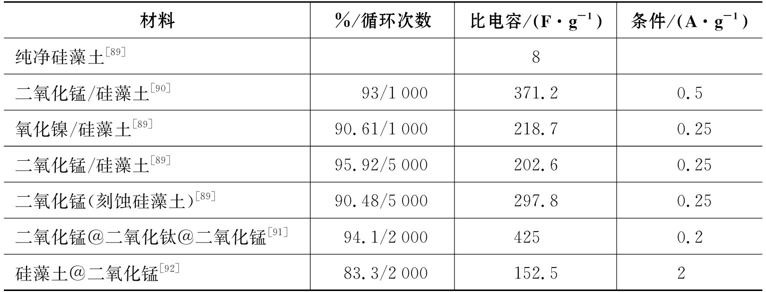 氧化镍(NiO)因其高比电容、高化学/热稳定性、易得性、环境友好性和低成本而在超级电容器中得到了很好的研究 [94-95] 。然而,大部分NiO的离子扩散常数和结构敏感性较低,这限制了它们的应用 [81,96] 。为了提高具有NiO纳米线的超级电容器的比电容,制备了分层多孔NiO苔藓装饰的硅藻土。高倍图像显示,硅藻壳一侧有数百个大孔隙规则排列,孔隙中几乎没有任何离散的杂质。发现独特的NiO改性硅藻土结构表现出218.7F·g -1 的比电容和出色的循环稳定性(1000次循环后保留率达90.61%) [89] 。基于这些电化学结果得出的结论是,分层结构对电解质扩散有影响,从而改善电化学性能,使NiO改性硅藻土成为高性能超级电容器的有吸引力的电极。