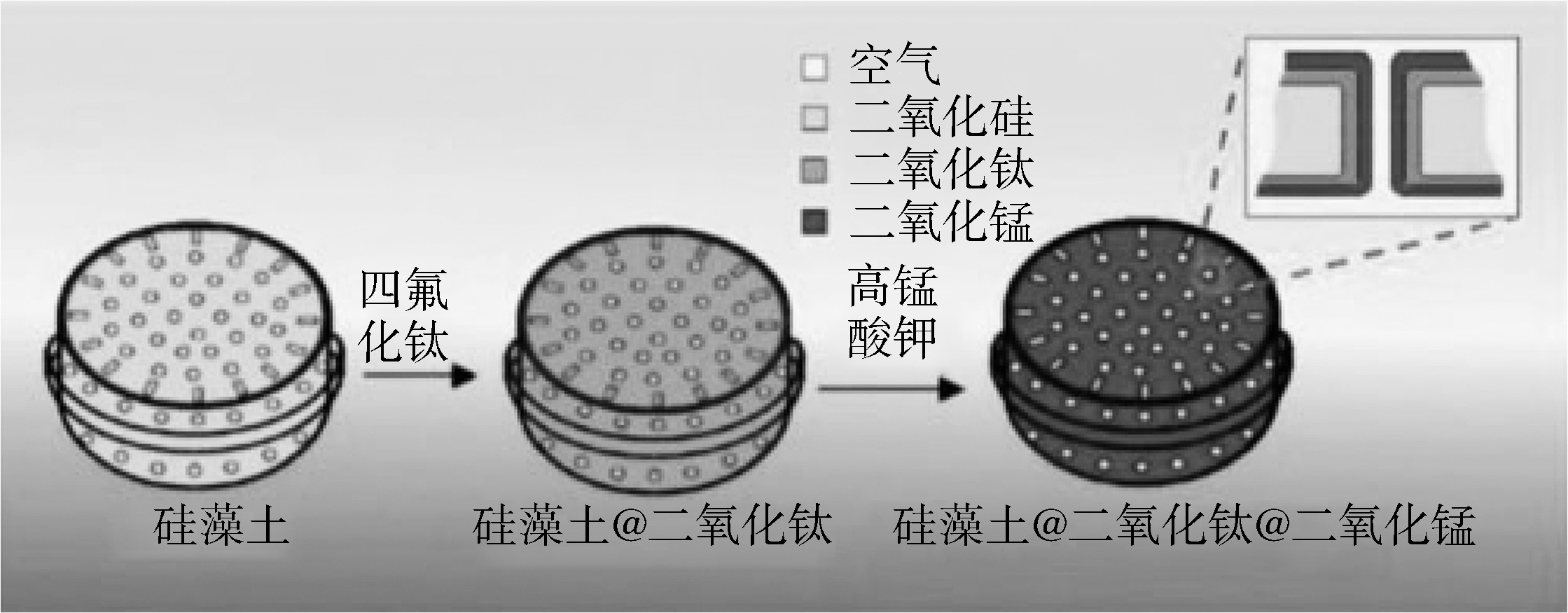 图4.6 硅藻@TiO 2 、硅藻@TiO 2 @MnO 2 三维复合超级电容器合成过程示意图 [91]