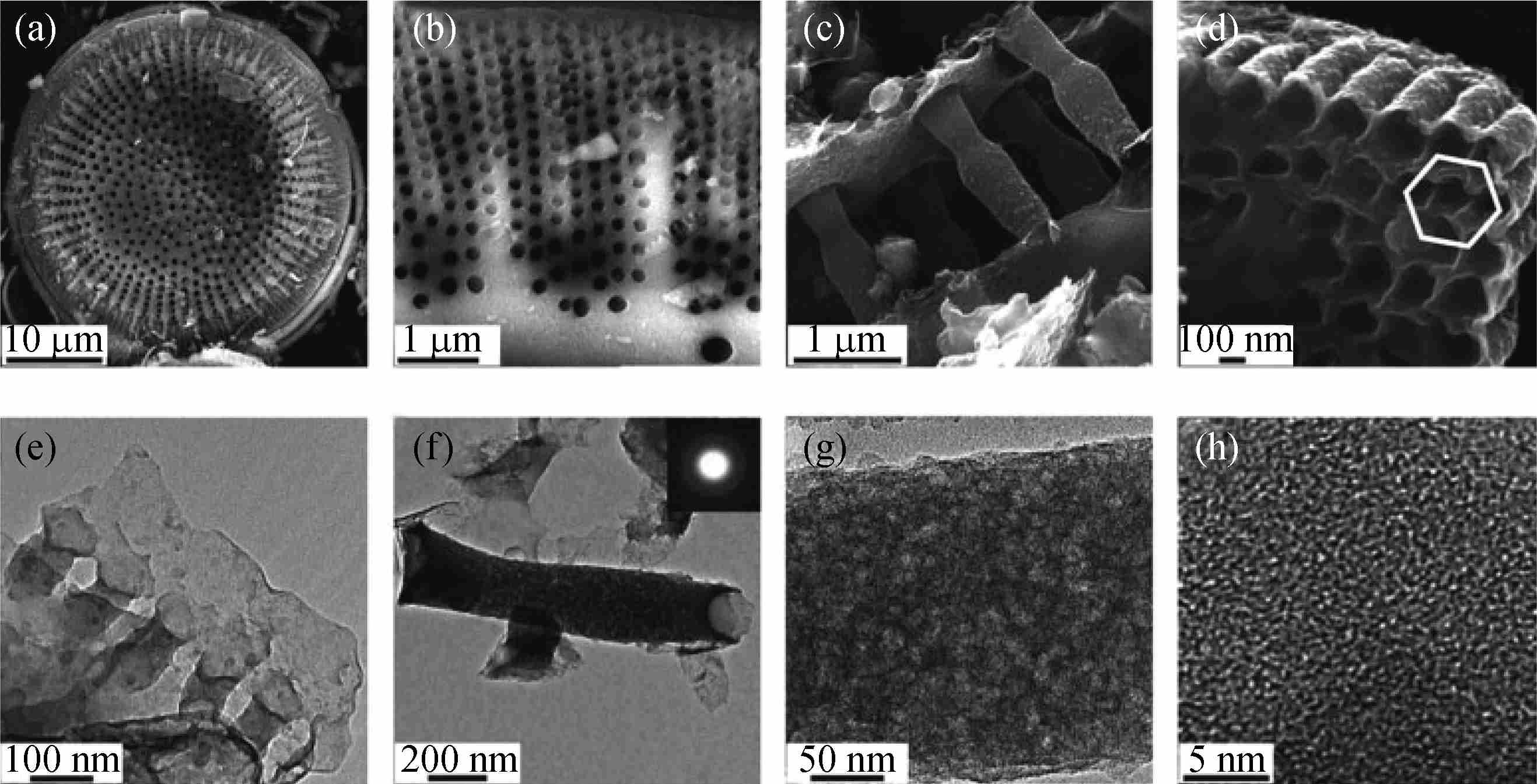 (a)硅藻壳;(b)硅藻壳边缘大孔;(c)碳柱的横截面图;(d)C/Dt CE 的有序大孔;(e)有序大孔的电子显微镜TEM图;(f)碳柱(插图:选区电子衍射SAED图);(g)碳柱中孔;(h)碳壁的微孔