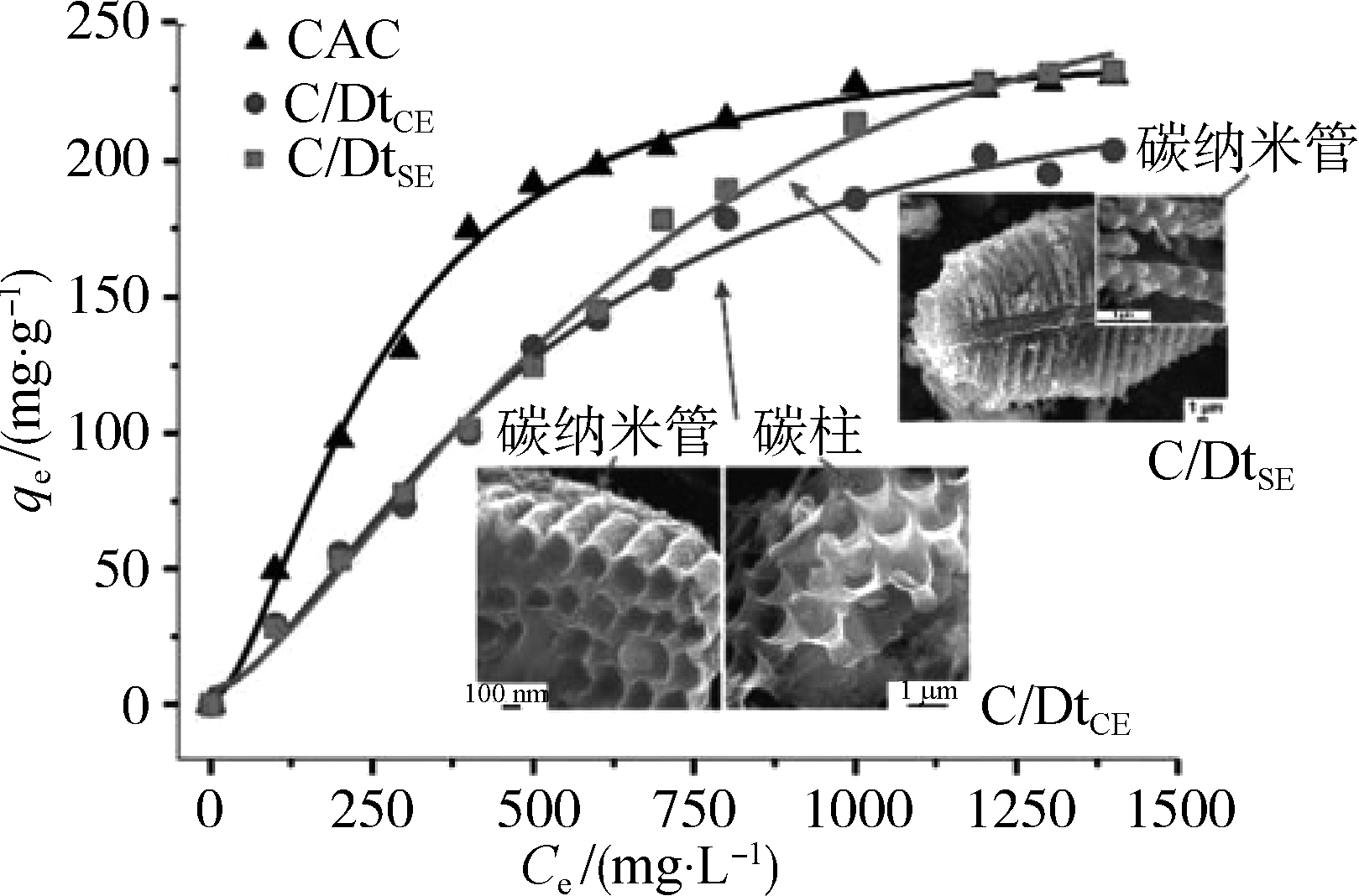 来自不同硅藻属的硅藻土表现出不同的形态和孔隙率,导致获得的硅藻土模板炭具有不同的结构和对亚甲基蓝(MB)的吸附能力。末端封闭的碳管来源于针杆藻属硅藻壳的复制(获得的碳表示为C/Dt SE ,图4.15)。三种吸附剂的比表面积单层吸附容量遵循C/Dt SE (333mg·g -1 )>C/Dt CE =商业活性炭(CAC,250mg·g -1 )的顺序。硅藻土模板碳比商业活性炭具有更高的MB吸附能力,在吸附和净化领域显示出良好的应用前景。