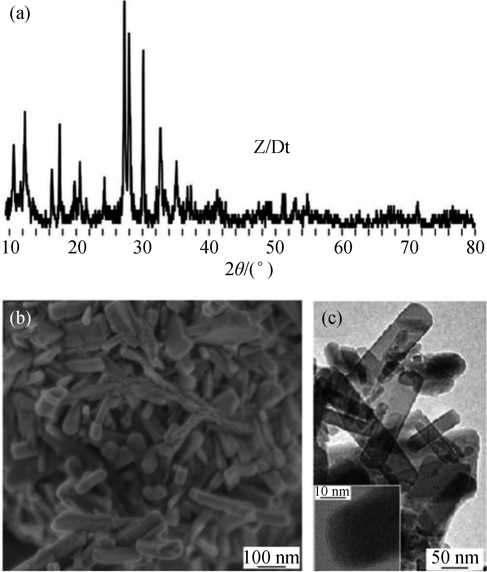 然而,必须指出的是,使用氟化氢(HF)作为蚀刻剂对硅藻土模板的蚀刻对环境具有潜在威胁。因此,在我们的研究中选择了氢氧化钾(KOH)来蚀刻硅藻土模板,我们发现KOH还可以作为活化剂来提高硅藻土模板化碳的孔隙率。分离出的碳产品在其表面负载KOH,在管式炉中于N 2 环境下再次碳化后,碳的孔隙率得到改善。KOH活化的硅藻土模板碳比原始碳和CO 2 活性炭具有更高的比表面积(988m 2 ·g -1 )、总孔体积(0.675cm 3 ·g -1 )和MB吸附容量(645.2mg·g -1 )。此外,以KOH蚀刻硅藻土模板得到的含硅和含钾溶液为硅源和钾源,制备了分子筛副产物K-H沸石(Z/Dt),如图4.17所示。沸石产品具有棒状形态和纳米尺寸的颗粒,具有以中孔为主的多孔结构。因此,硅藻土不仅作为催化剂和模板剂,还作为硅源制备碳材料和沸石,为废液回收利用提供了一种经济可行的简便方法。
