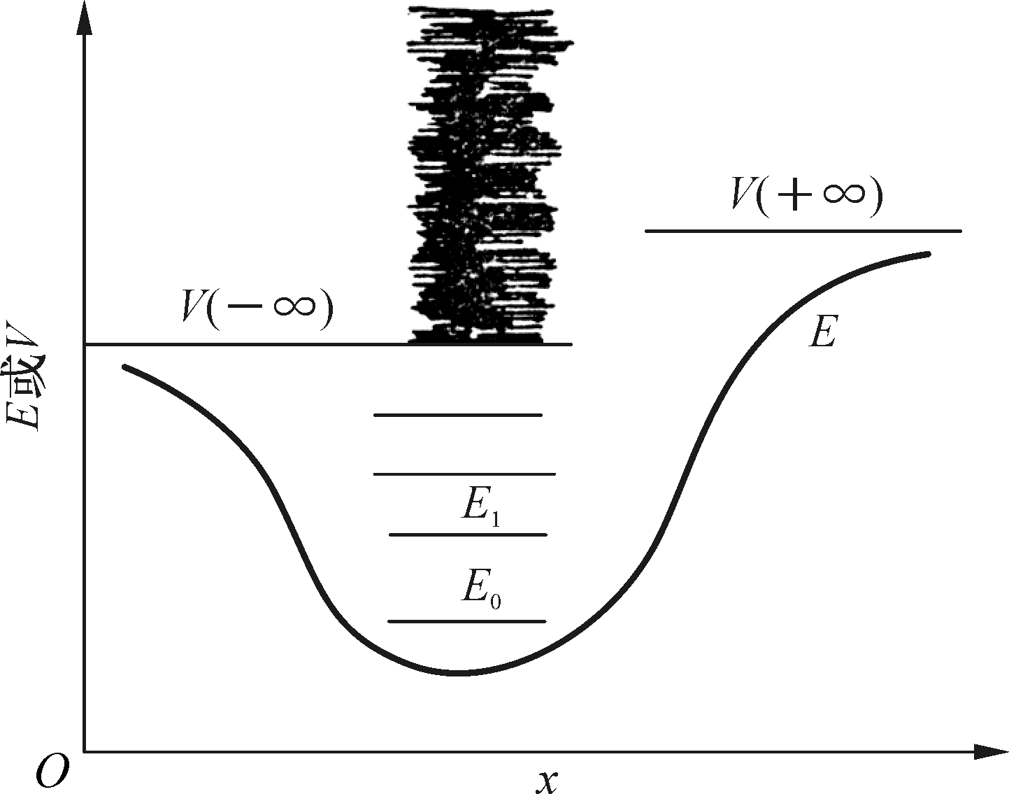 对一给定的体系,特性能值E n 可以是一组断续值,或者有一连续的区间,也可以是两种情况都有. 和光谱相似,常常说在这三种情形中能值是一组断续谱、连续谱,或两者并存. 习惯地把图2.1所表示的体系的特性能值标记成:E 0 是最低态,E 1 其次,并依此类推. 这些能值与波函数ψ 0 (x)、ψ 1 (x)、ψ 2 (x)等是对应的.E n 和ψ n (x)的下标n(整数)叫作量子数. 对这样一个一维体系,数n等于ψ n 所有的节点数目. 正如图2.1所示,假使E大于V(-∞)或V(+∞)中的一个,分析的结果指出,E的值是连续的,因此,当x→-∞或x→∞时,如果V(x)趋近有限值,特性能值就会同时有连续谱和断续谱.