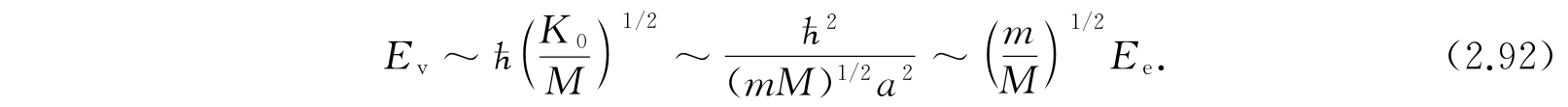 为了估计振动能,我们把每一种简正振动型看作质量为M和弹性系数为K 0 的谐振子.M和典型的核质量同级.K 0 可以这样估计,沿一简正振动型位移一分子尺度a那样大的距离,一定会产生数量级相当于E e 的能量变化,因为这样大的位移一定会引起电子波动的畸变;因此我们令K 0 ~E e /a 2 . 于是与一个低能振型联系的能量是