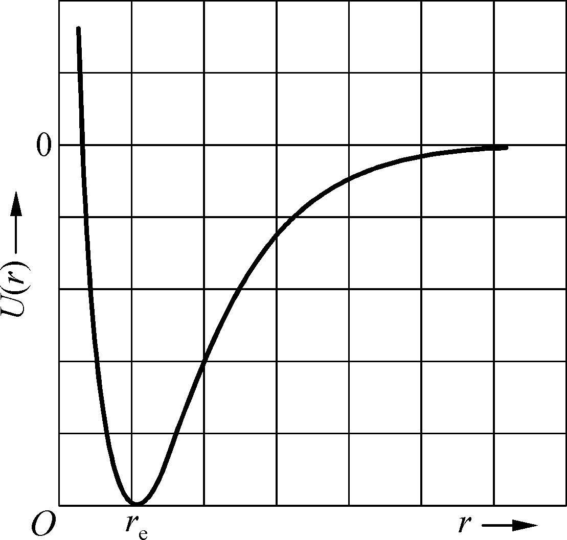 基于一些像氢分子那样的简单分子的计算和实验的结果,我们知道对一个稳定的双原子分子U(r)的曲线,在平衡距离r e 处有一个极小值,当r<r e 时曲线很陡地上升,而在r>r e 时则很平地伸展出去,就像图2.5给出的那样. 当分子处在较低振动态时,核处在平衡位置附近. 对这些能态,只有近r e 的一段U(r)才是重要的. 对于高能态,振动的振幅来得大了,就需要完整的U(r)曲线. 在r增大时U趋近一个常数,这一性质对较高的能级有特殊的意义,并且反映了这样的事实:只要有足够的能量传递给分子,它就会离解成两个原子.