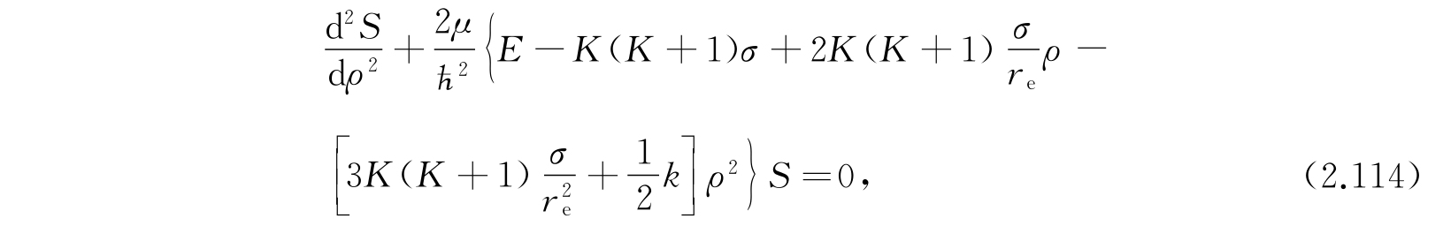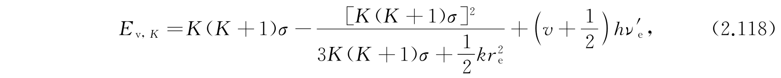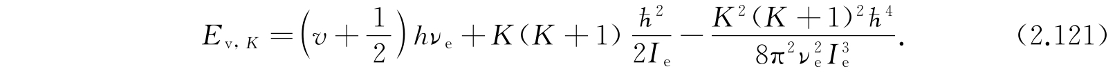 第一项显然是分子被看作谐振子的振动能;第二项是假定分子为刚体时的转动能;第三项的来源是:考虑非刚性分子由于转动产生分子的伸长,伸长后角惯量又有所改变,因此又产生这个修正项. 更高次的项并不可靠,因为所假定的势函数不够精确. 大多数分子的实验数据很好地适合方程(2.121). 对于更精确的工作,还需要其他的项并且需要比式(2.111)更精确的势函数.