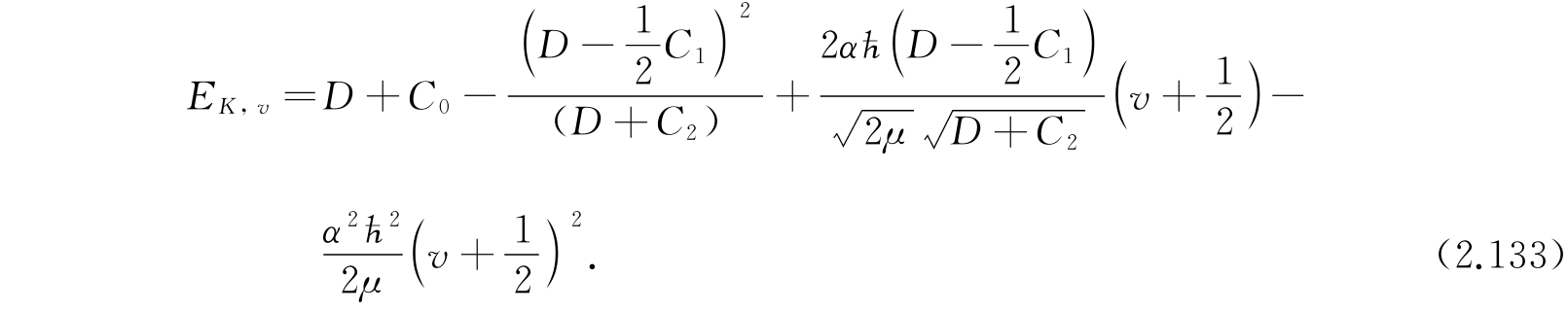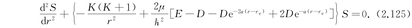 给出. 根据假定的势函数V(r),显然由式(2.134)计算的E只当E<D时才有意义. 对E>D,按照2.2节的一般讨论,能级应该是连续的而不是间断的. 所以间断能级的数目是有限的. 在应用式(2.134)时必须记住这一事实. 基态(v=0,K=0)的能量是