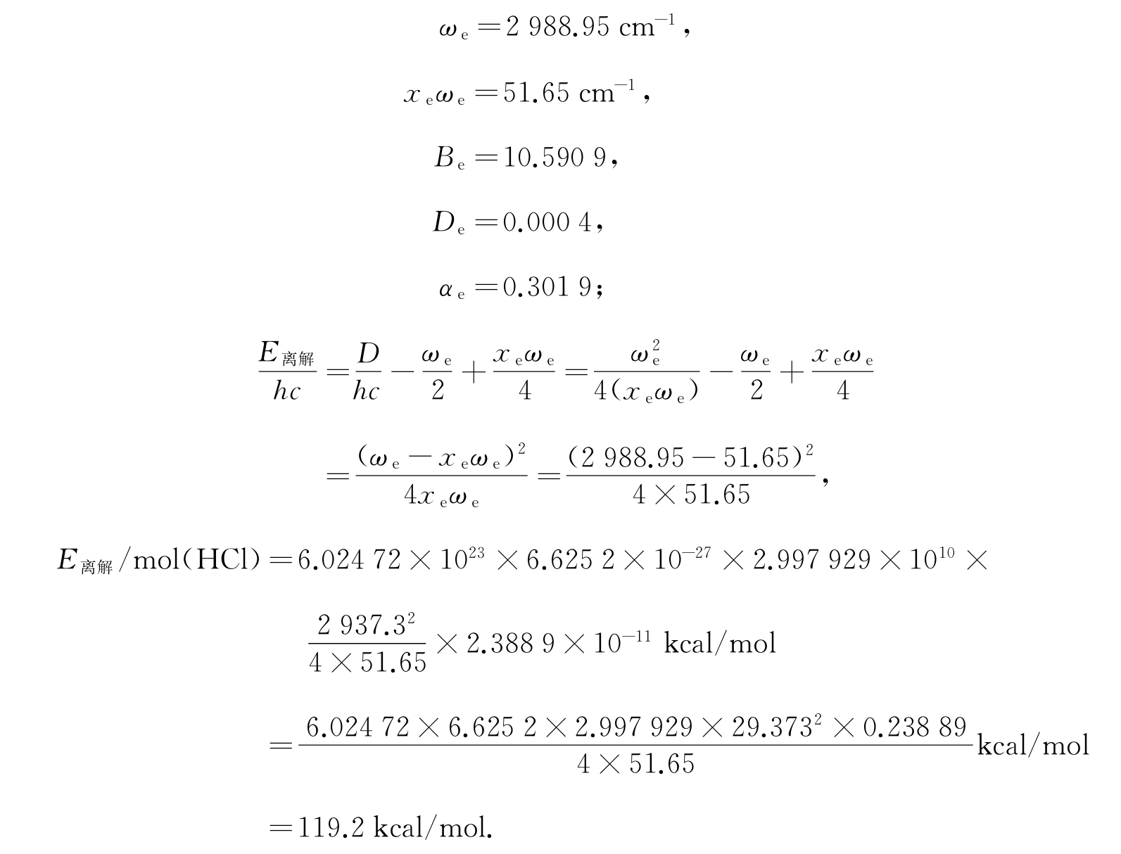 D可以按照式(2.135)由ω e 和x e 计算出来,所以离解能也可以从光谱数据计算出来. 但是式(2.135)由各种近似得到,这样测定的离解能不可能希望是准确的;实际上也常和用更直接的方法所确定的数值不很一致. 我们可以举一个例子,考虑氯化氢(HCl)分子,就有