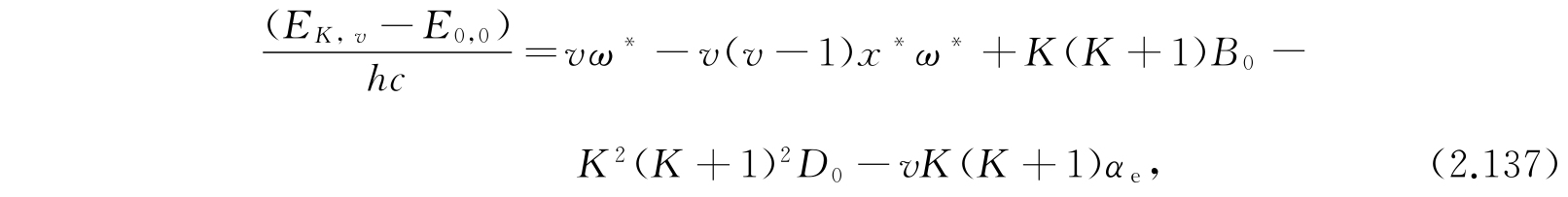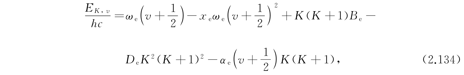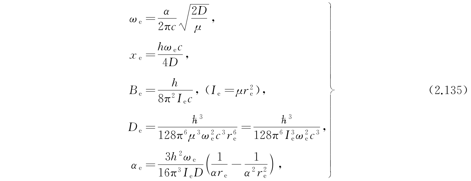 这一关系式几乎对所有双原子分子都能给出非常精确的能级数值. 无须说明,所有的计算是关于较低电子能级的. 式(2.134)中的常数的实验值曾经由赫兹堡(G. Herzberg)