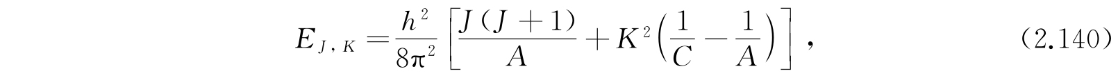 假如分子是线性的,转动态就已经在2.15节中讨论过了. 若分子是非线性的,但有这样的对称轴使得绕对称轴的转动惯量是C,而绕另两个通过重心垂直对称轴的转动惯量都是A,则分子就是一个对称陀螺. 对这样一个对称陀螺,转动能级已计算出来(可参看量子力学的书籍),