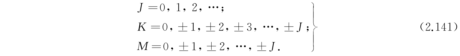 其中J是总的转动量子数. Kh/2π是角动量沿陀螺对称轴的分量. 除这些量子数外,还有另一个量子数M;Mh/2π给出沿任意固定在空间中的轴的分量. 这些量子数可能取的值是