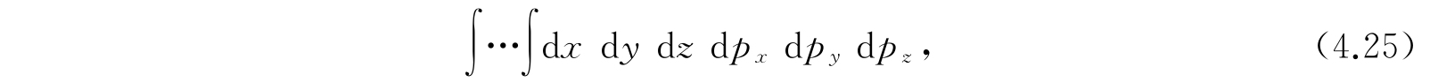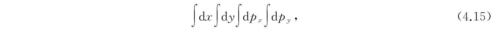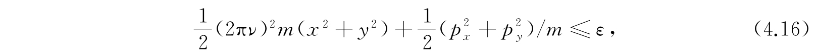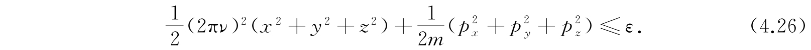 令n x +n y =n,则每一个n对应于一个不同的能值. 但每一个n值可以由n x 和n y 的(n+1)种不同的组合来得到. 因此,ε=(n+1)hν给出的ε值是对应于(n+1)个不同的本征函数. 所以能级ε=(n+1)hν的权重为n+1. 如要验证极限原理,只要我们能够指出:与一个量子能级相关联的经典相空间体积,与量子数n很大时和值(n+1)h 2 没有很大差别. 在相空间(x,y,p x ,p y )中,能量等于常数ε的曲面所包围的体积为
