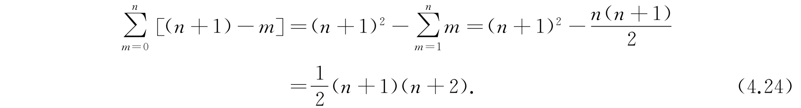 的本征函数的数目等于使n x +n y +n z =n时n x 、n y 、n z 为正整数或零的解的数目. 现在我们计算这个数目,令n x 取值m,于是n y 可能取的值就有(n+1)-m个. 故本征函数的数目为