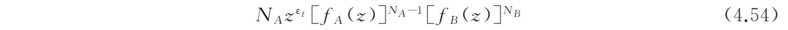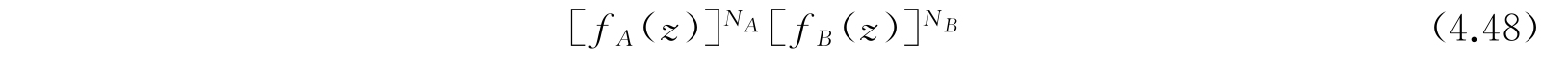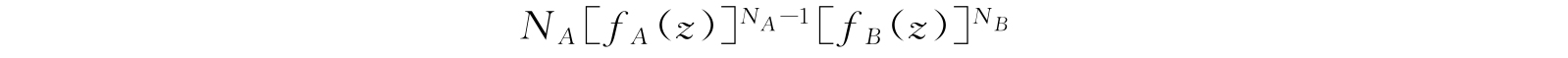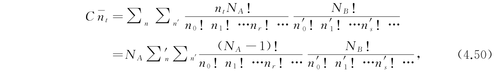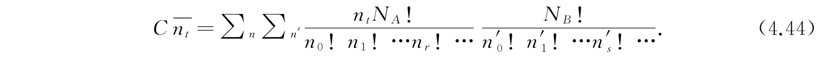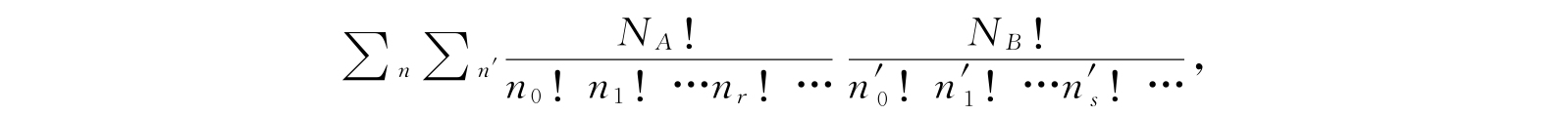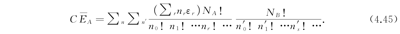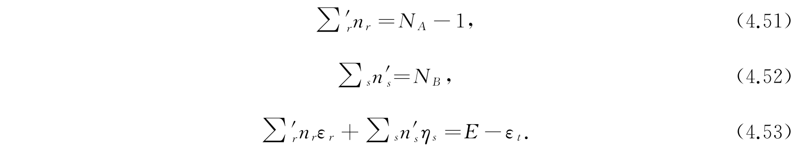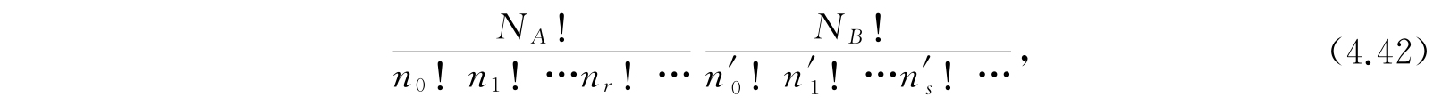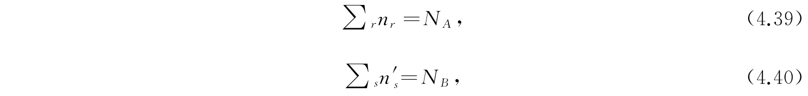 条件(4.39)、(4.40)及(4.41)表示了几个事实,即体系A的总数是N A ,体系B的总数是N B 及总能量为E. 在式(4.41)中,体系A的能量ε r 与体系B的能量η s 的零点可以各自任意选取;而E的零点取决于ε r 及η s 的零点. 对于给定的N A 、N B 及E,任何一组满足式(4.39)、(4.40)及(4.41)的正整数(或零)n r 、n' s ,都代表系集的一个统计状态. 因为系集是第一种类型的并且体系的权重都是1,因此,这个统计状态的权重是