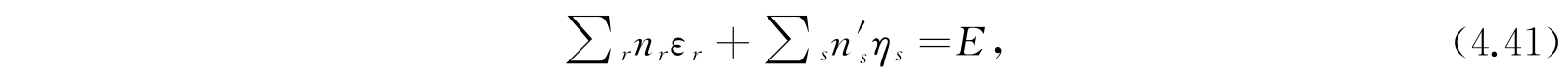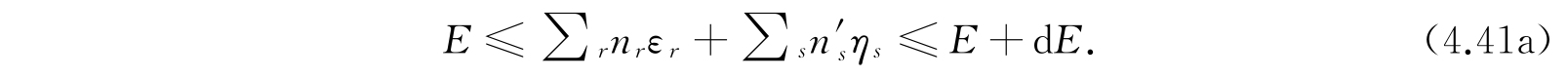其中E是系集的能量,那么,这一组n r 、n' s 给出系集的一个可及统计状态. 关于可及性的限制,在第3章中我们已经讨论过,然而在第3章中,我们是要限制全系集的能量于一个能量小区间(E,E+dE)中,而不是式(4.41)所表示的限制于一定的能量值E. 因此,按道理,我们不应该用式(4.41)而应该用