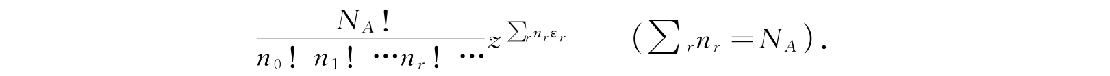 为了叙述简单起见,我们先考虑一个特殊情形,由这个特殊情形,我们可以看到一般问题的特点及其处理的方法. 考虑一个包含有两大组定域线性振子的系集,两组振子的个数各为N A 和N B . 每一A组振子都有一系列权重为1的定态,其能量为ε 0 ,ε 1 ,…,ε r ,…;同样,B组振子也有权重为1的一系列定态,其能量为η 0 ,η 1 ,…,η s ,…. 这里我们再一次指出,我们能够将定态和能量写成各个体系的定态和能量,实际上是由于我们暗中应用了一个假设,即这些体系是近独立的,也就是说,它们绝大部分时间是进行着自己的运动而不受其他体系运动的干扰. 这个假设对于处理由大量基本上独立的(不是完全独立的)体系组成的系集是很重要的,因为如果能够把状态表成各个体系的状态,会使我们的计算大大简化. 与此同时,我们必须假定振子之间一定也要有足够的能量交换,而且要经常地进行着,倘使不是这样,那么这些体系也就不能成为一个系集,因而也就不会有单一的平衡分布律了. 在目前这一特殊情形中,我们可以假想能量交换是由于振子所处的包壳中有少量的自由原子在进行着这一工作,但是这些自由原子的数目比振子的数目少得多,以致它们本身的能量可以忽略不计.