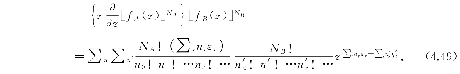 式(4.44)及(4.45)中的求和,都是对于满足式(4.39)、(4.40)及(4.41)的n r 、n' s 求和. 下面我们将指出,式(4.43)、(4.44)及(4.45)这样一些表示式的右方,都是某些简单幂级数的系数. 在下面的数学运算中,如果我们能够假设ε r 、η s 都是某一能量单位的整数倍并且没有公因子,那么,这些运算会简单得多. 这个条件是很难完全准确地满足的,但是我们可以借助于选取一个适当小的能量单位而使它高度近似地满足. 现在我们假设已经选了这样的能量单位. 我们可以证明,即使ε r 、η s 不能满足这个条件,其结果并不受影响.