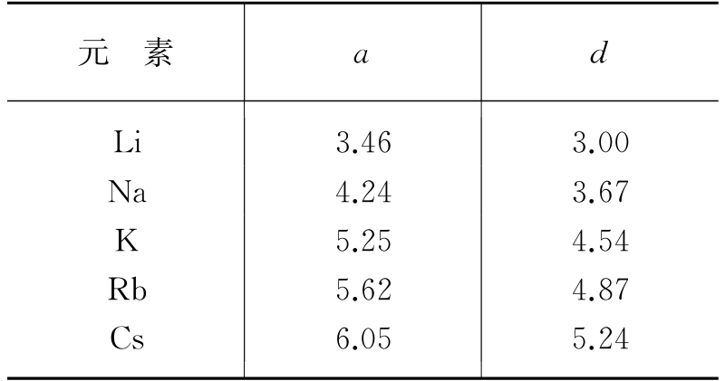表1.1 碱金属的体心立方a、d值 (单位为Å)