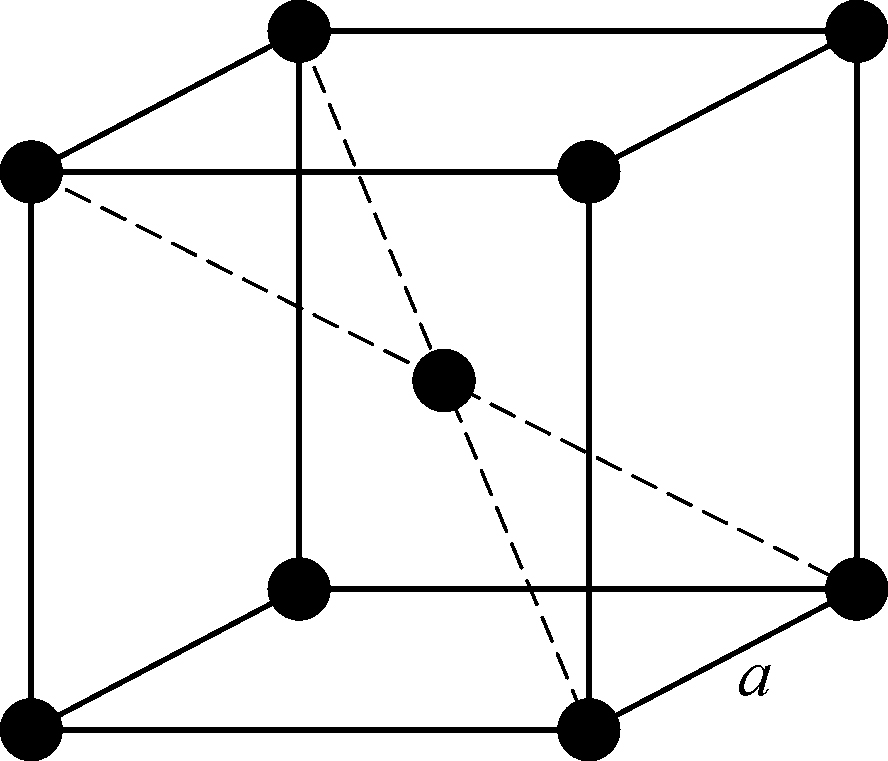 固体分子间的相互作用很强烈,致使形成了完全有规则的结构——晶格. 例如碱金属:锂(Li)、钠(Na)、钾(K)、铷(Rb)和铯(Cs)都有同样的体心立方格子,如图1.1所示. 原子占据了立方体的中心和各个角隅. 如果立方体的边长为a,最邻近的原子间距为