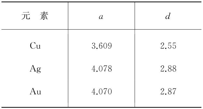 表1.2 一价贵金属的面心立方a、d值 (单位为Å)