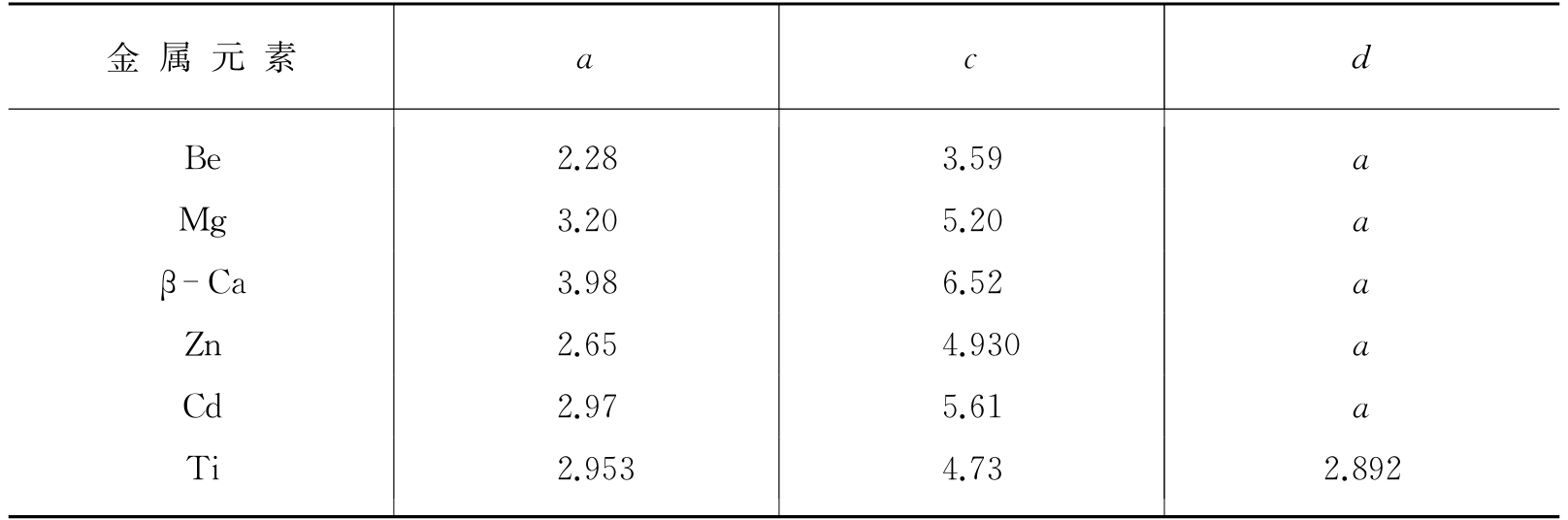 表1.3 六方密堆积结构的金属的a、c、d值 (单位为Å)